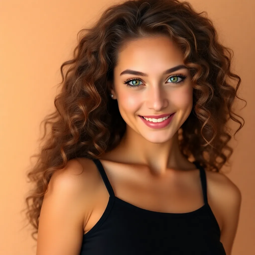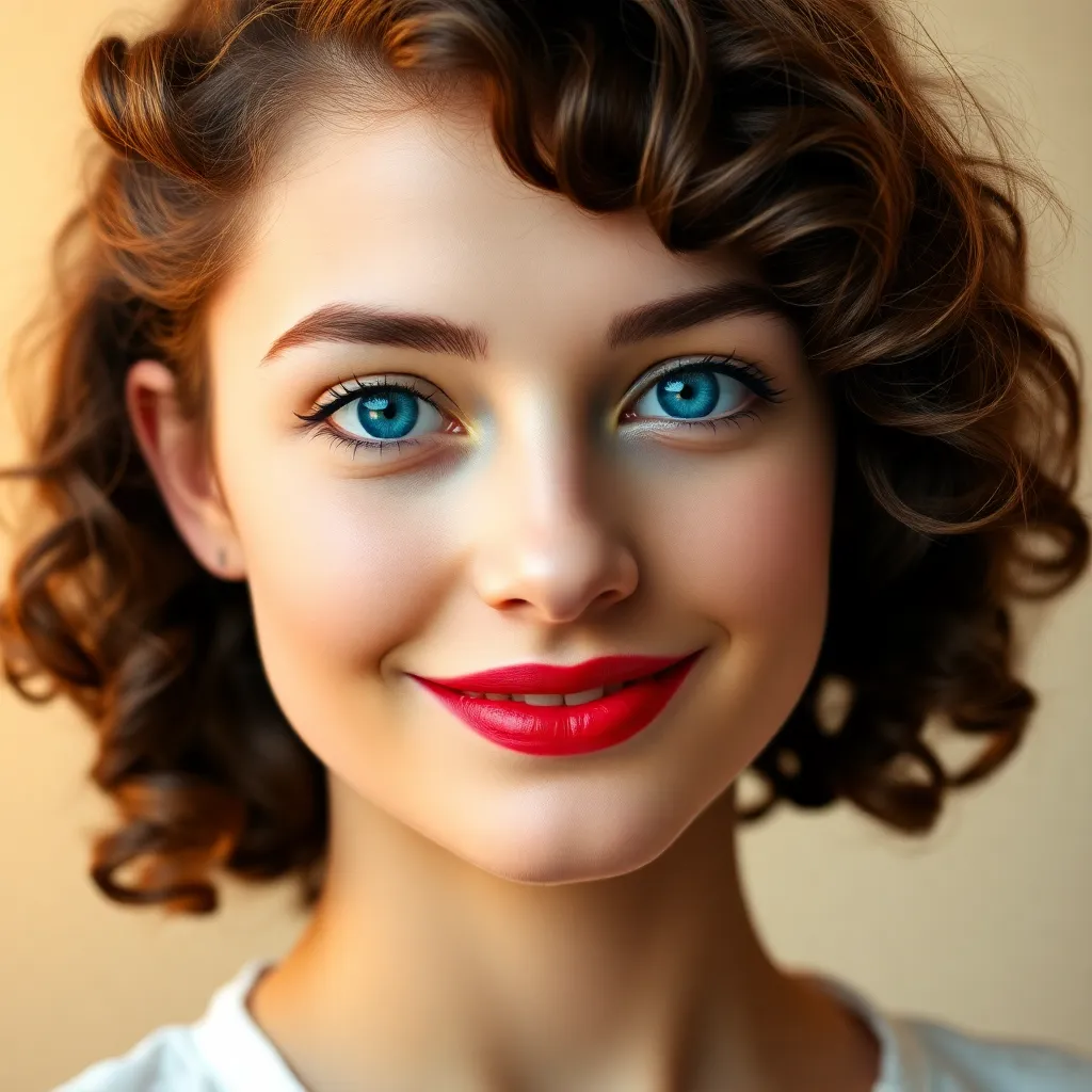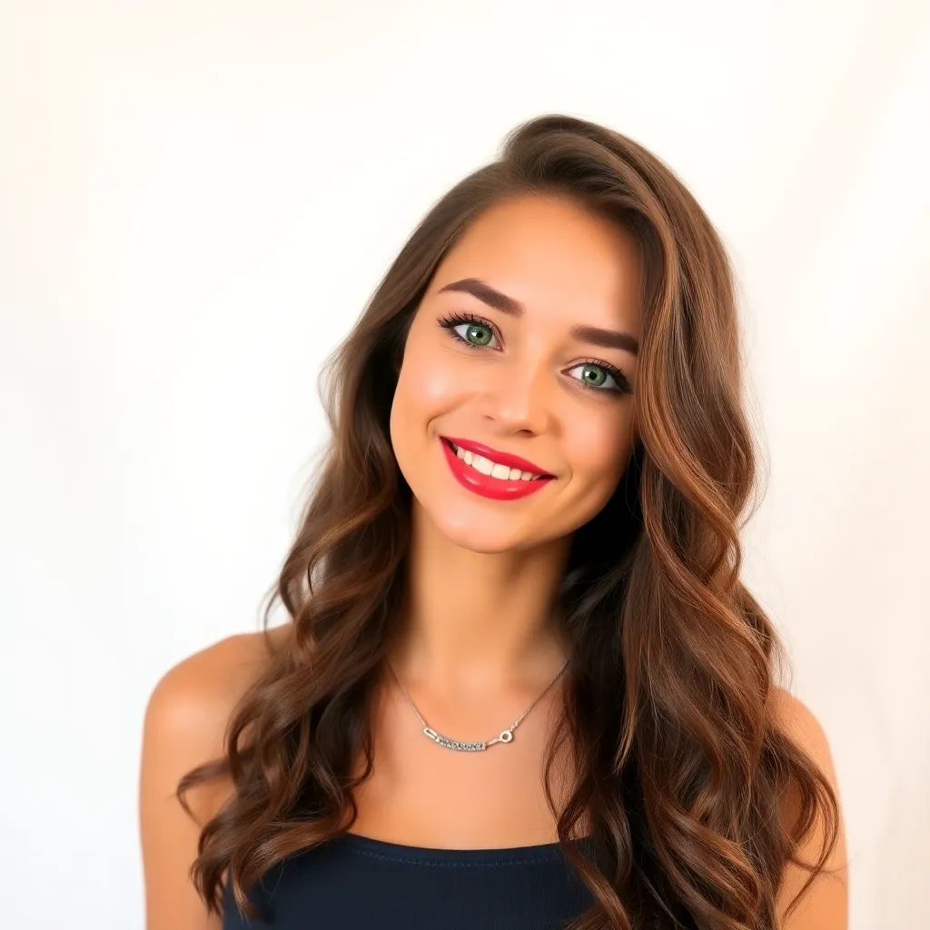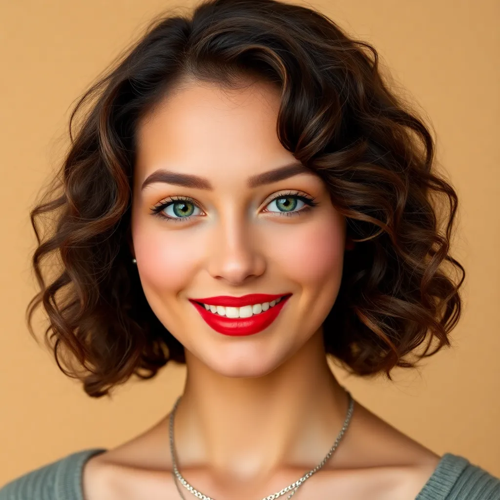 Create a stunning model headshot. Imagine a young woman with piercing green eyes, shoulder-length curly brown hair, and a bright smile. She's wearing a bold red lip color and a minimalist silver necklace. The background is a soft, warm beige. Capture her confident and alluring personality in this AI-generated image.