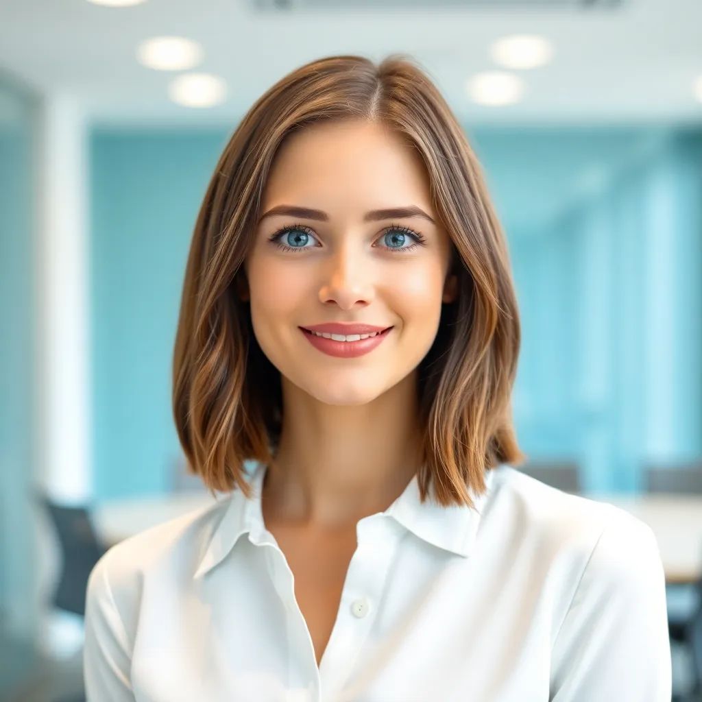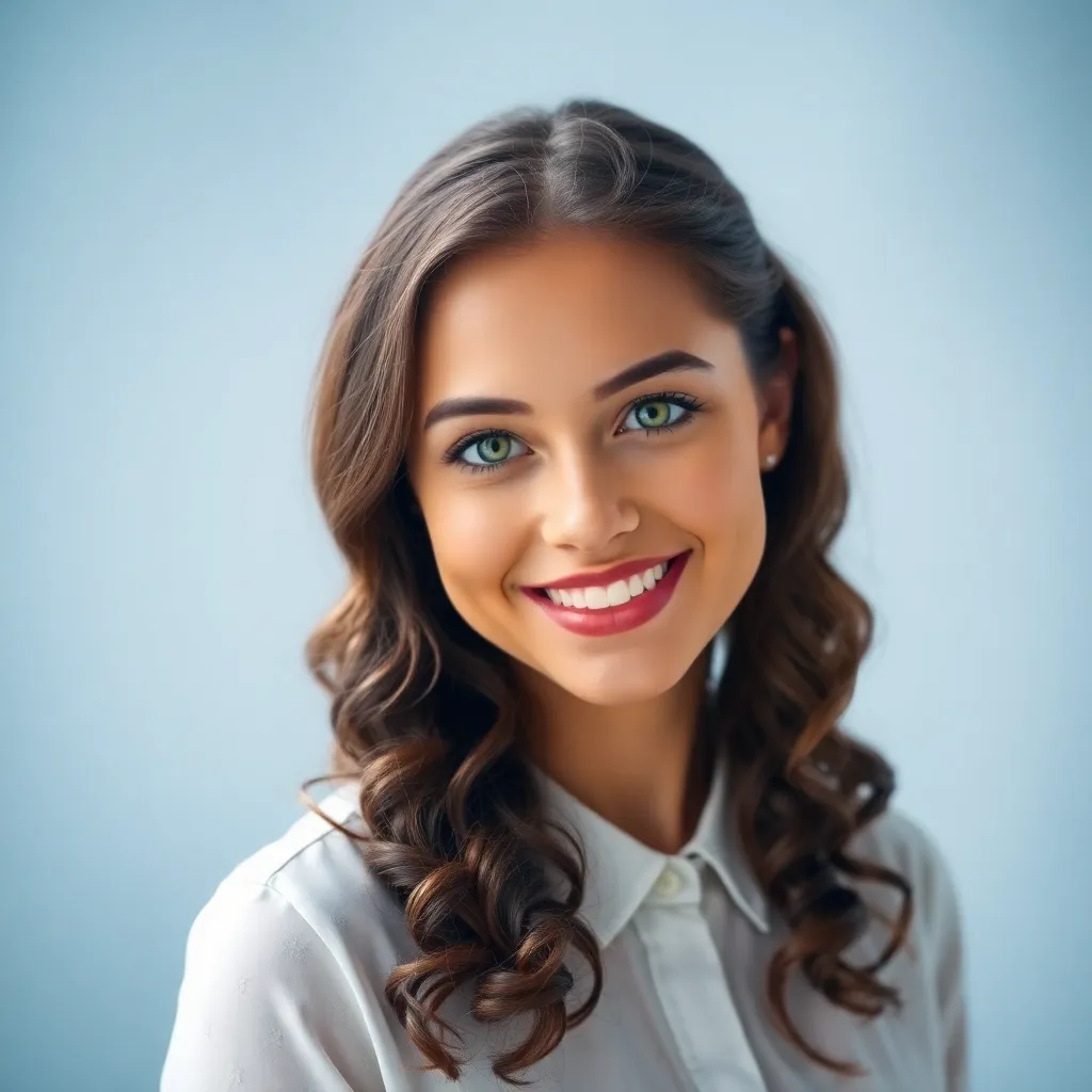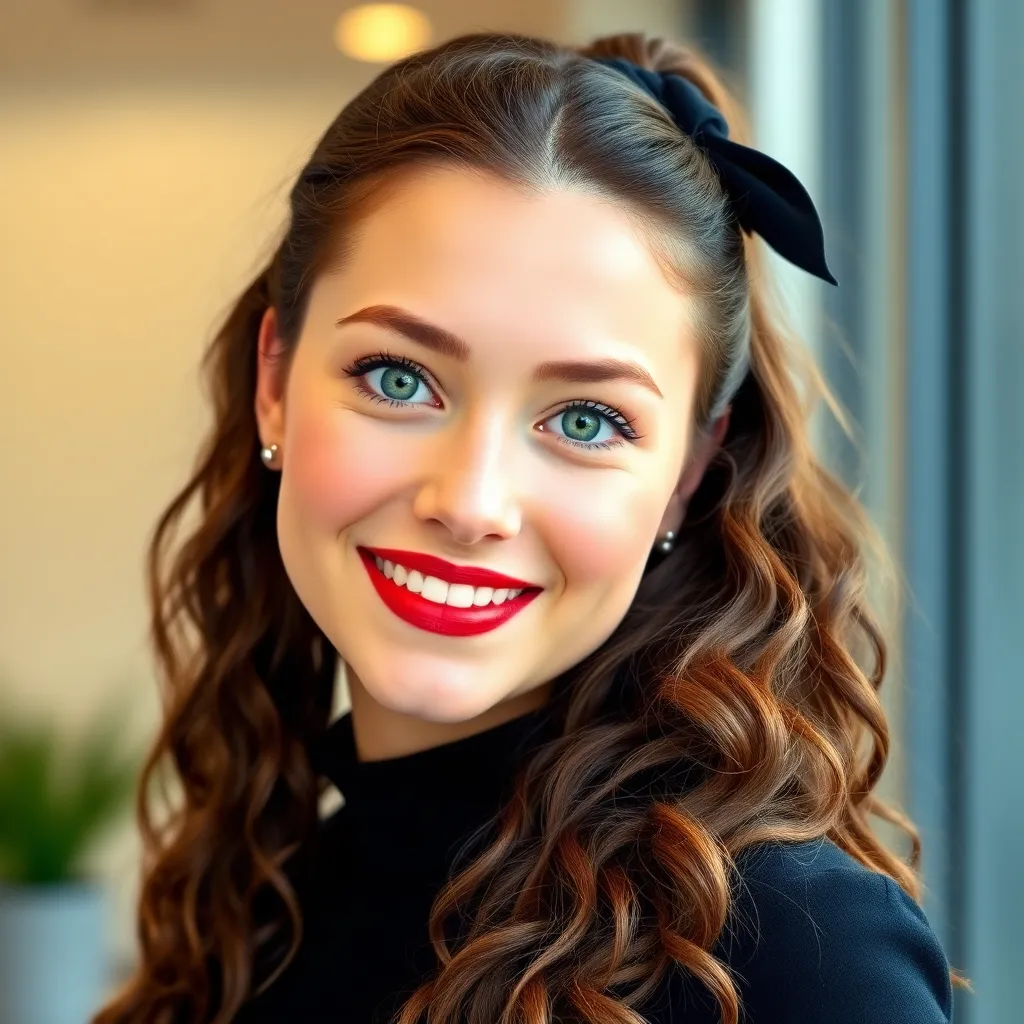Create a stunning model headshot! Imagine a professional, 25-year-old model with piercing blue eyes, curly brown hair, and a bright smile. Dress her in a sleek, modern outfit, with a bold red lip color. Set the scene in a luxurious, high-end studio with a minimalist backdrop and soft, natural light.