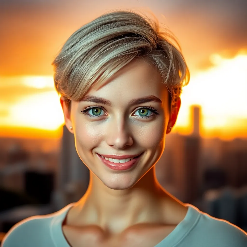 Create a stunning model headshot with a bold, modern aesthetic. Imagine a young adult with piercing green eyes, short blonde hair, and a bright smile. The background is a blurred cityscape at sunset, with a warm golden glow. The subject is looking directly at the camera with confidence and charisma.
