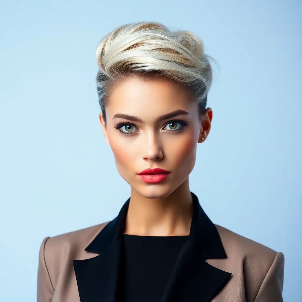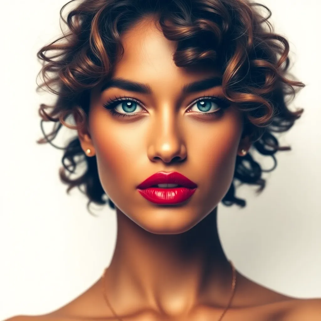 Create a stunning model headshot of a confident and charismatic individual with striking features. The subject has short, curly brown hair and piercing blue eyes. They're wearing a bold, red lip color and a subtle, golden necklace. The background is a soft, creamy white with a subtle gradient effect.