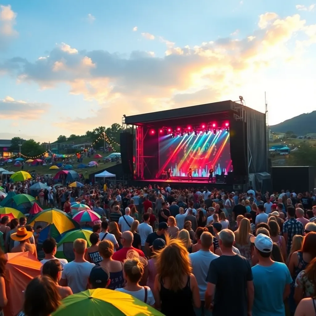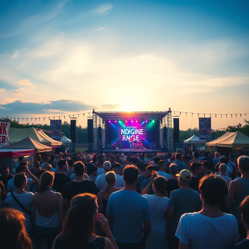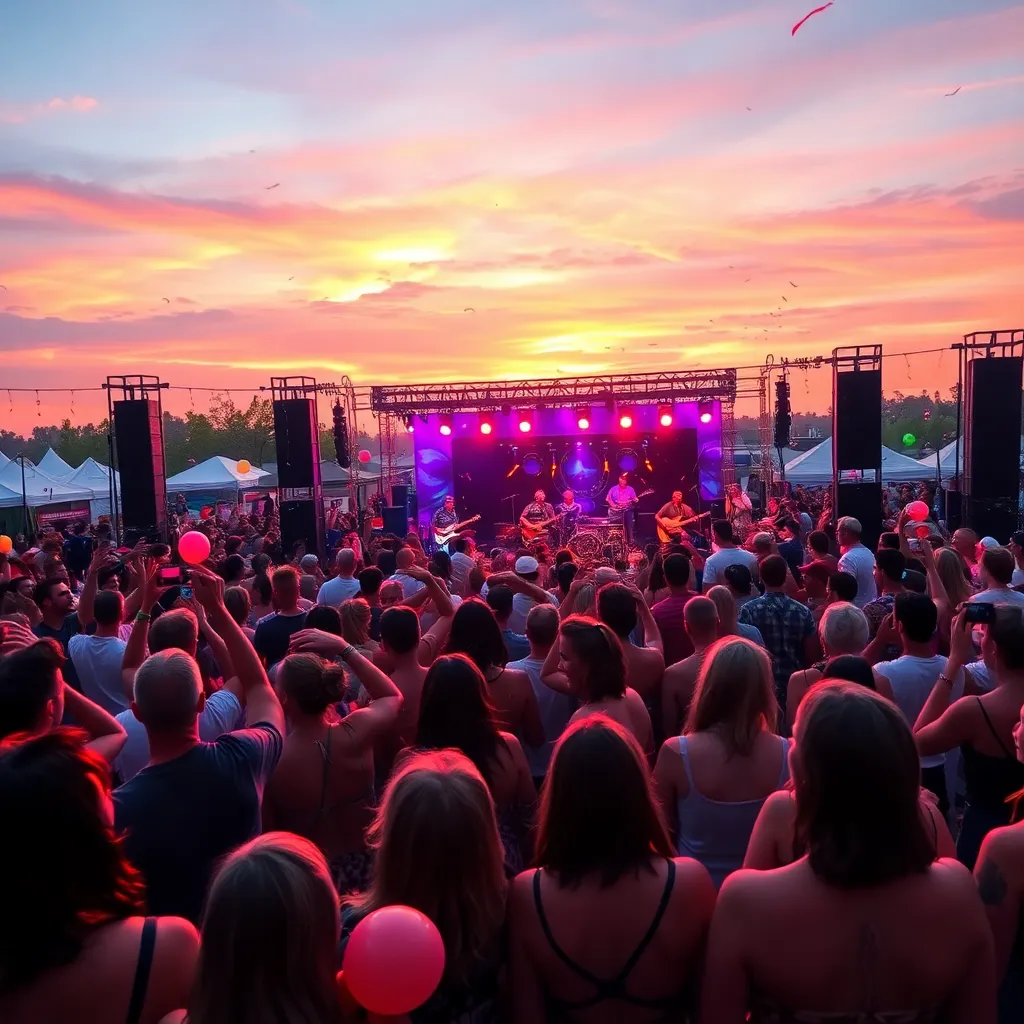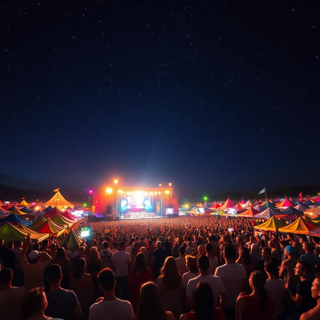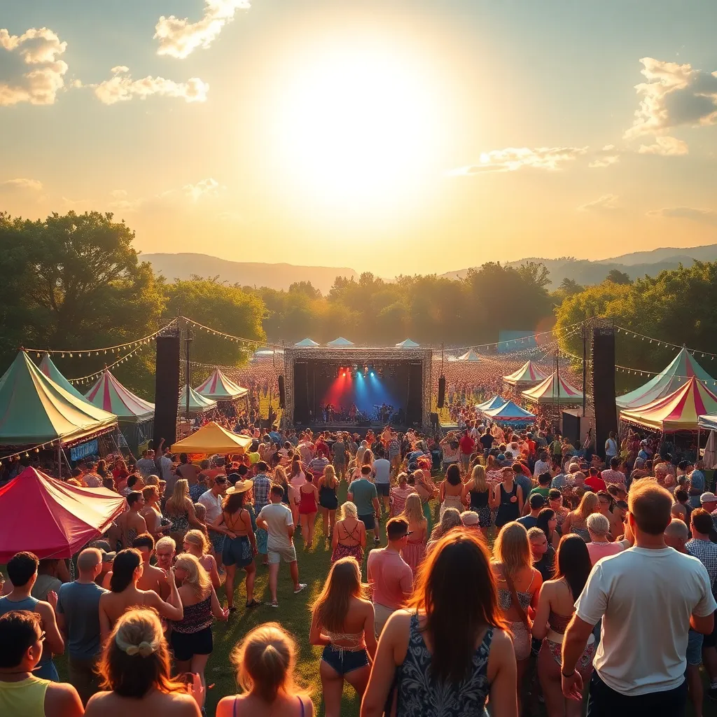 Imagine a vibrant music festival on a warm summer evening. The sun has set, casting a golden glow over the crowd. The main stage is lit up with colorful lights, and the sound of a lively indie-rock band fills the air. People are dancing and singing along, surrounded by food stalls and merchandise tents.