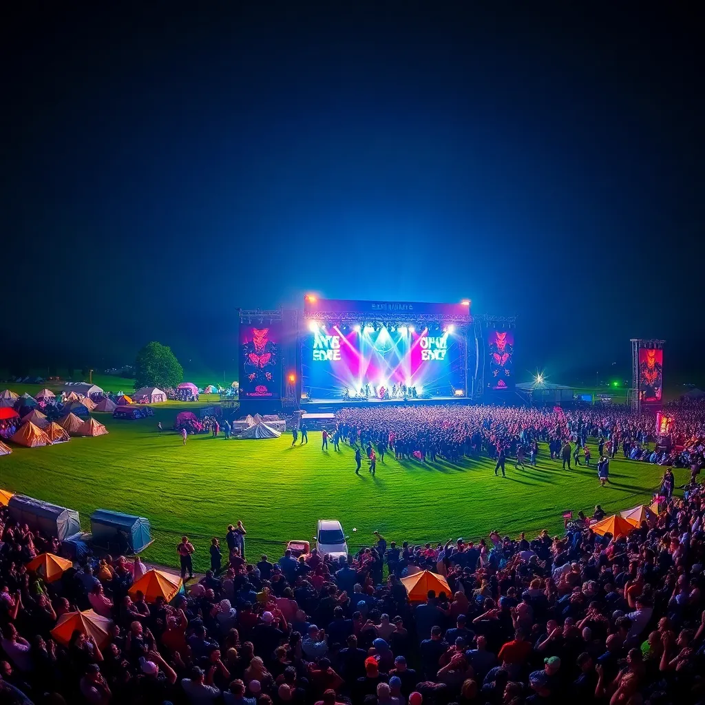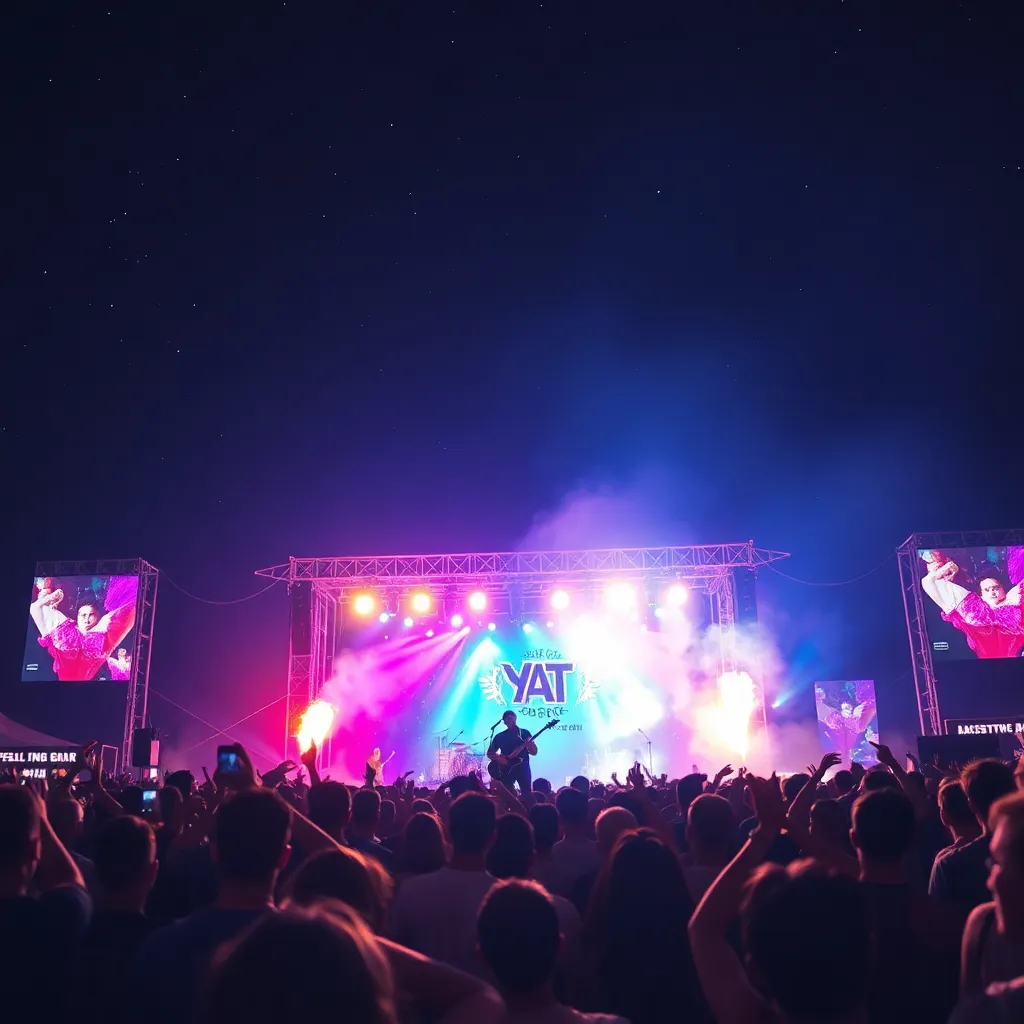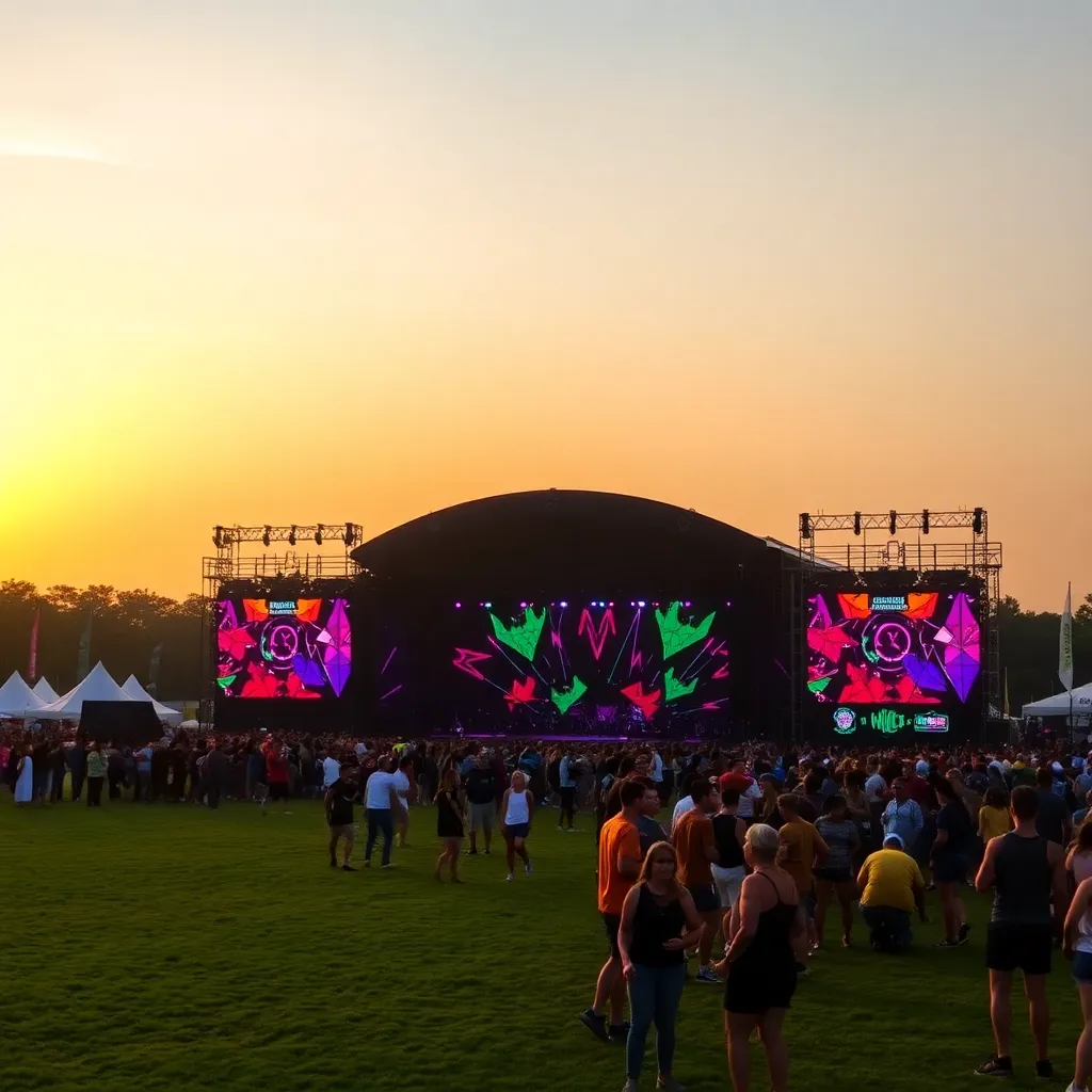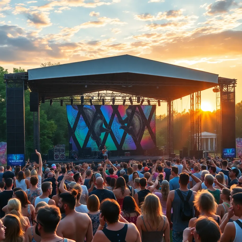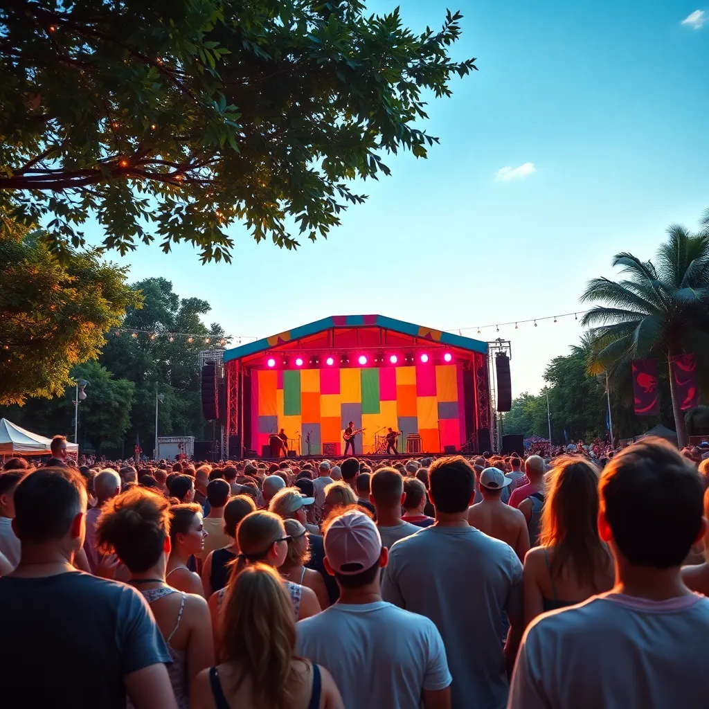 Imagine a vibrant music festival on a warm summer evening. The sun has set, casting a golden glow over the crowd. The main stage is lit up with colorful lights, and the sound of a lively indie-rock band fills the air. People are dancing and singing along, surrounded by food stalls and merchandise tents.