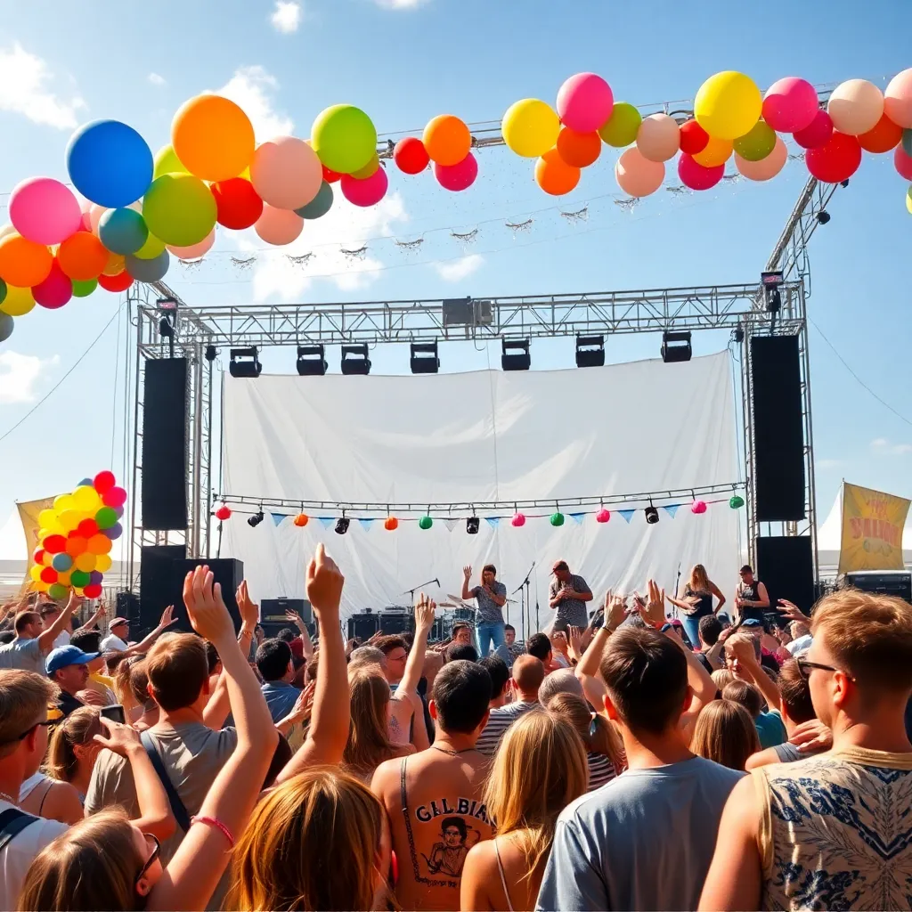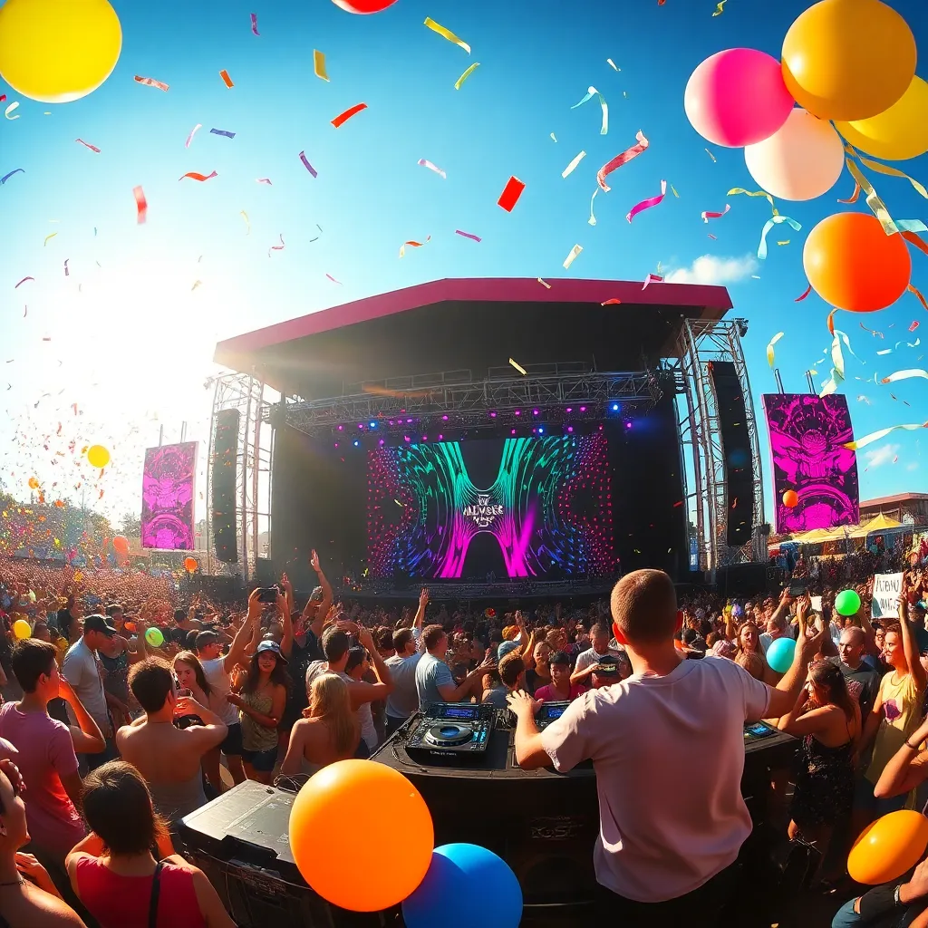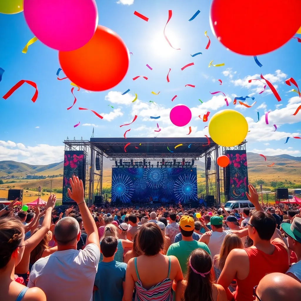 Imagine a vibrant music festival on a sunny day. A colorful stage backdrop is adorned with twinkling lights, surrounded by a sea of people dancing and singing along to their favorite artists. The atmosphere is electric, with confetti cannons and balloons adding to the celebratory vibe. Capture the excitement!