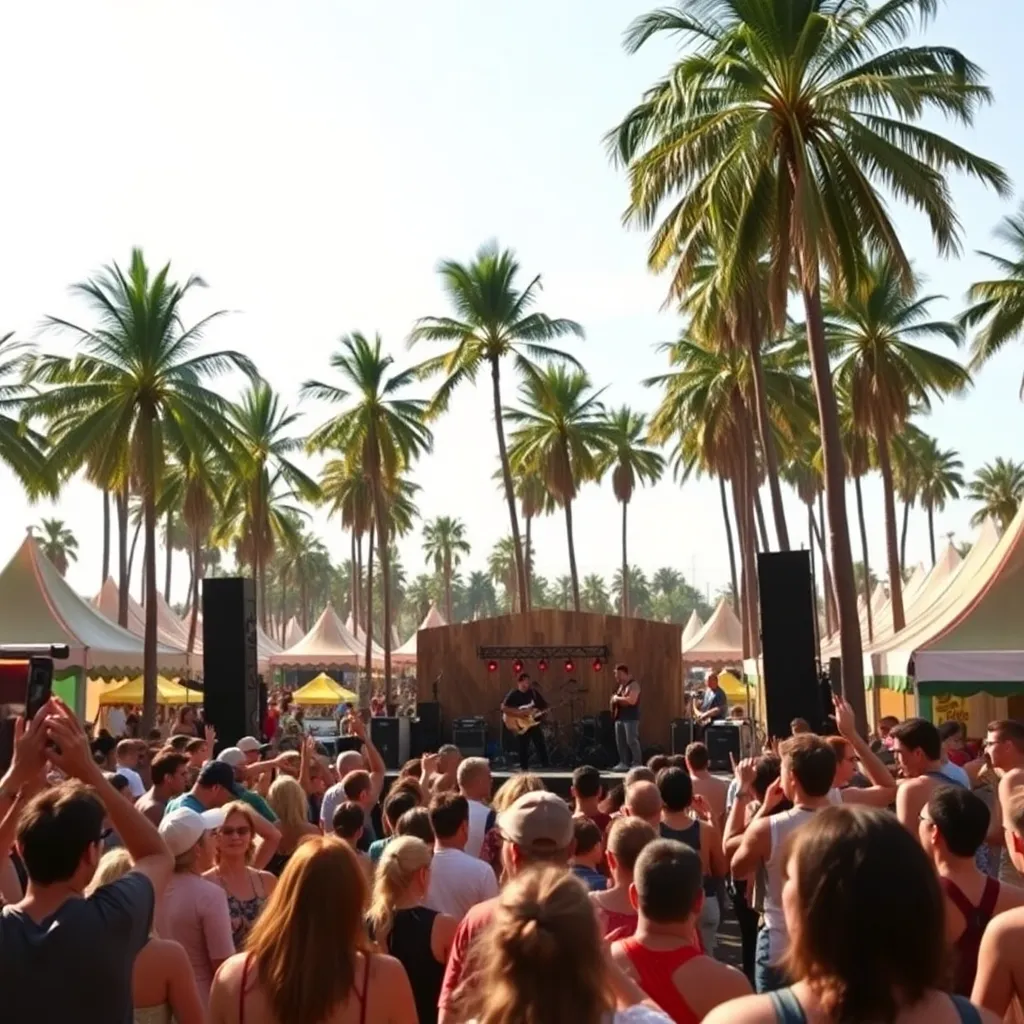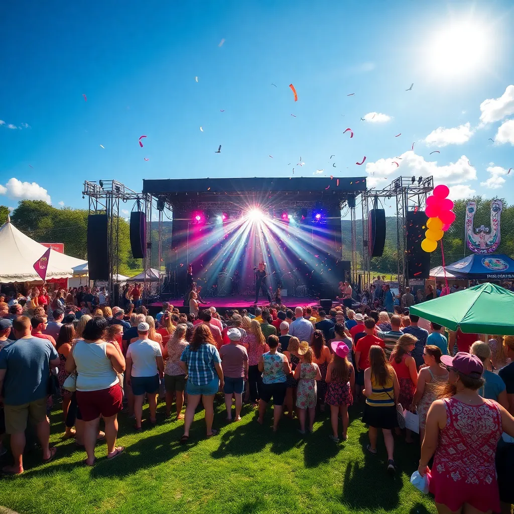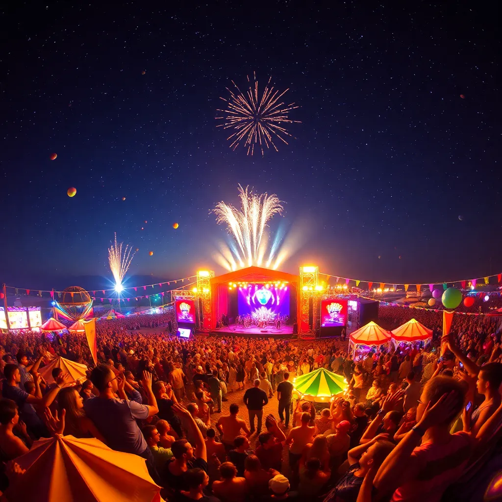 Imagine a vibrant music festival on a sunny day. A colorful stage backdrop is adorned with twinkling lights, surrounded by a sea of people dancing and singing along to their favorite artists. The atmosphere is electric, with confetti cannons and balloons adding to the celebratory vibe. Capture the excitement!