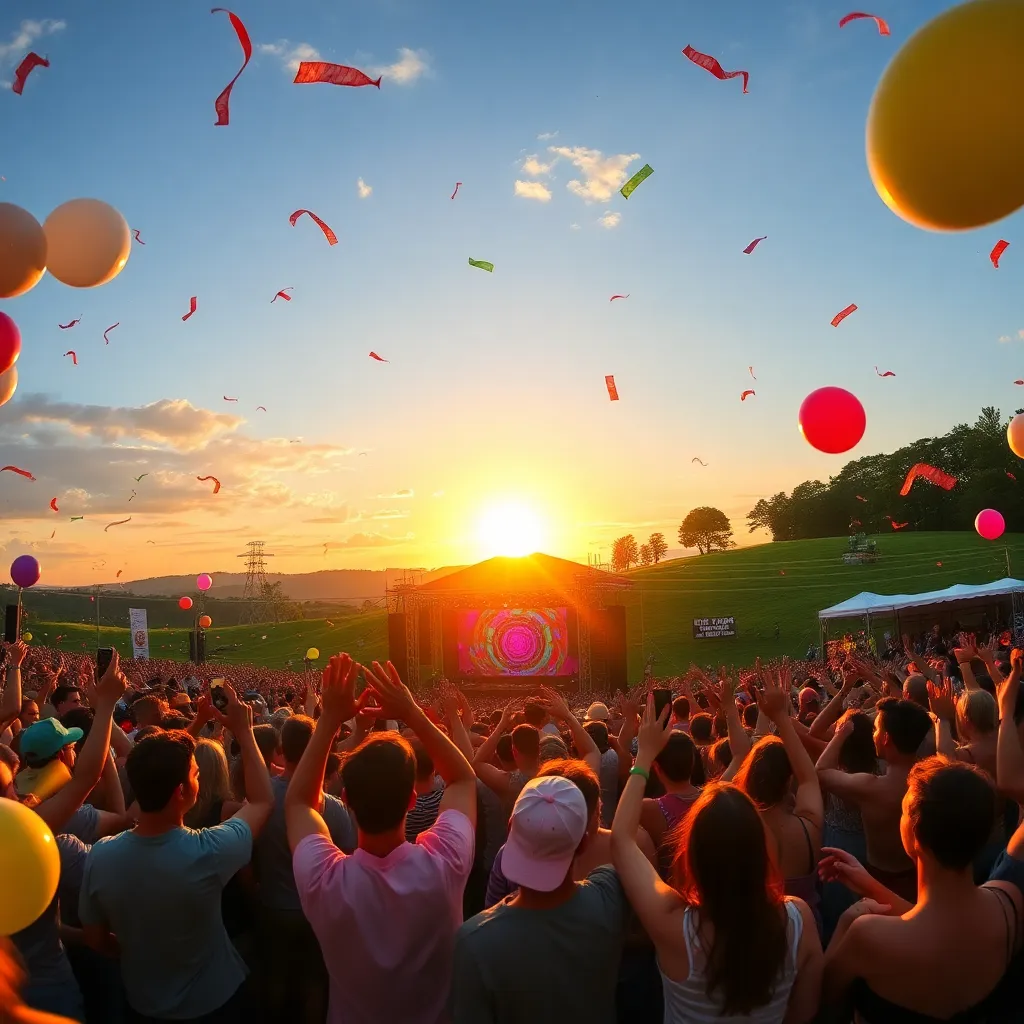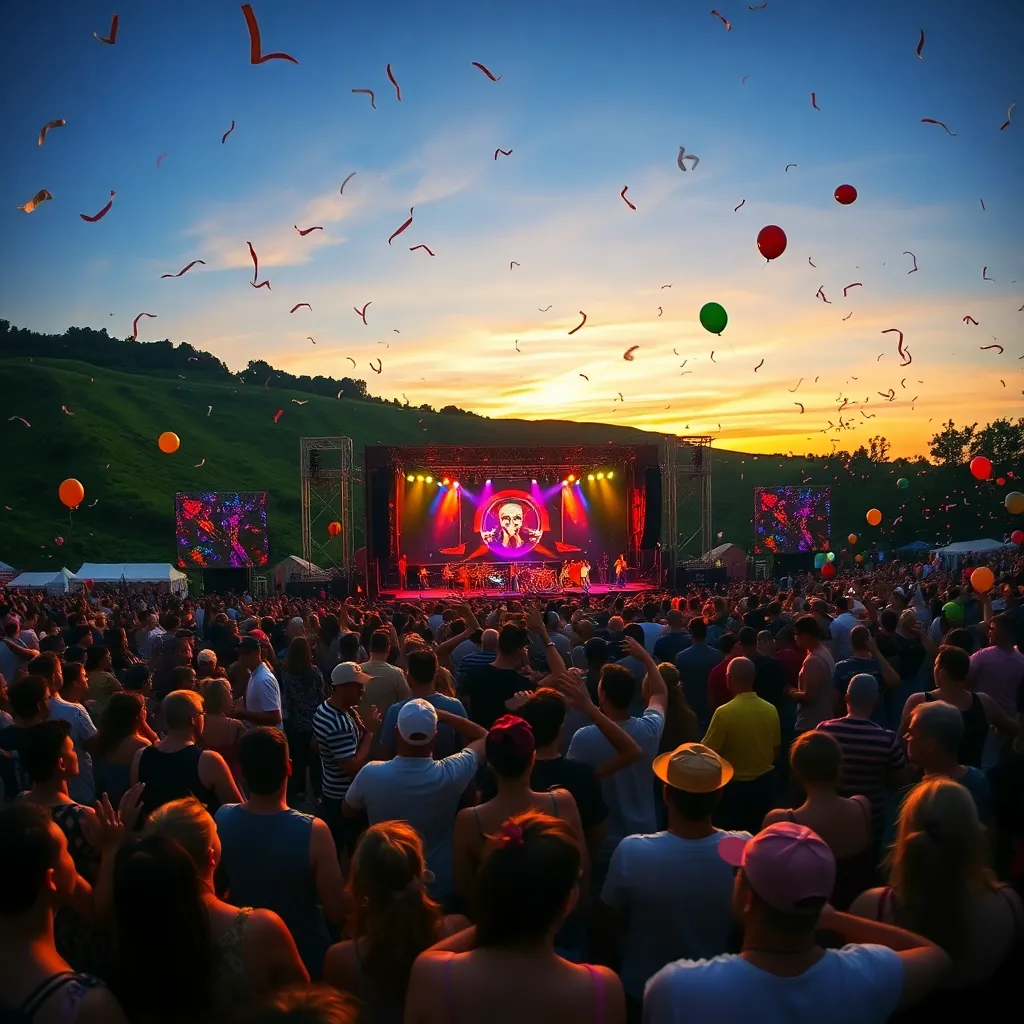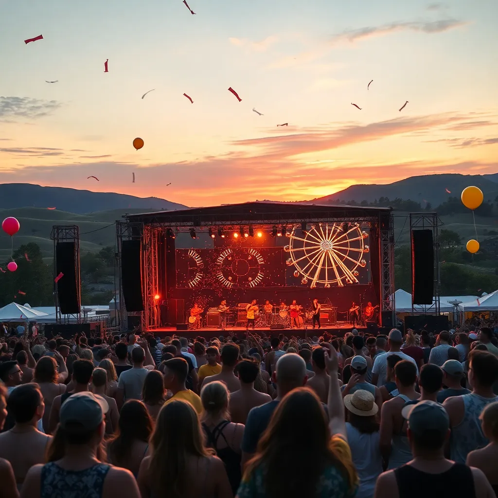Create an AI-generated image of a vibrant music festival scene at sunset. The stage is set against a backdrop of rolling hills, with a crowd of diverse festival-goers dancing and singing along to a lively indie-rock band. Confetti and balloons fill the air, and a giant Ferris wheel glows in the distance.