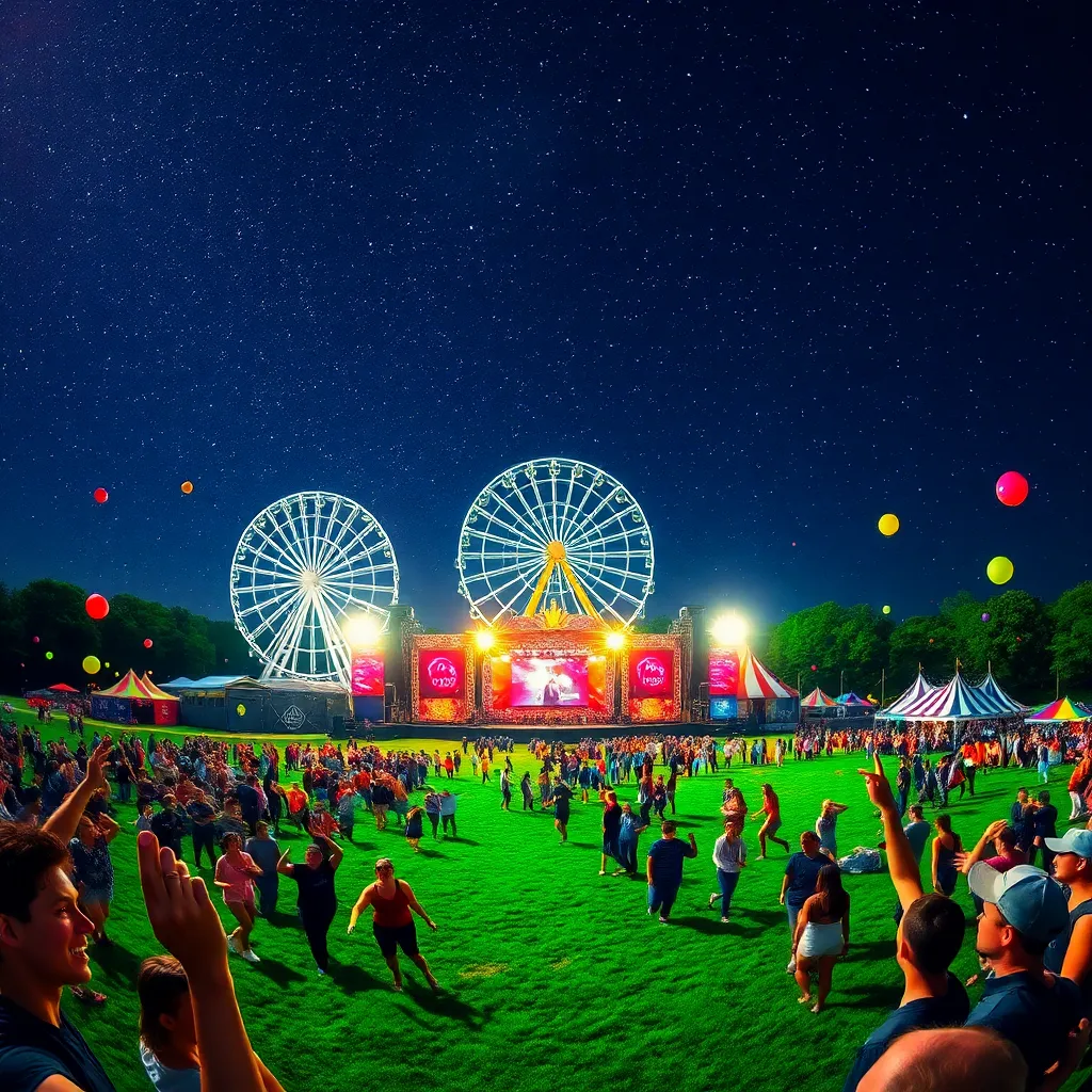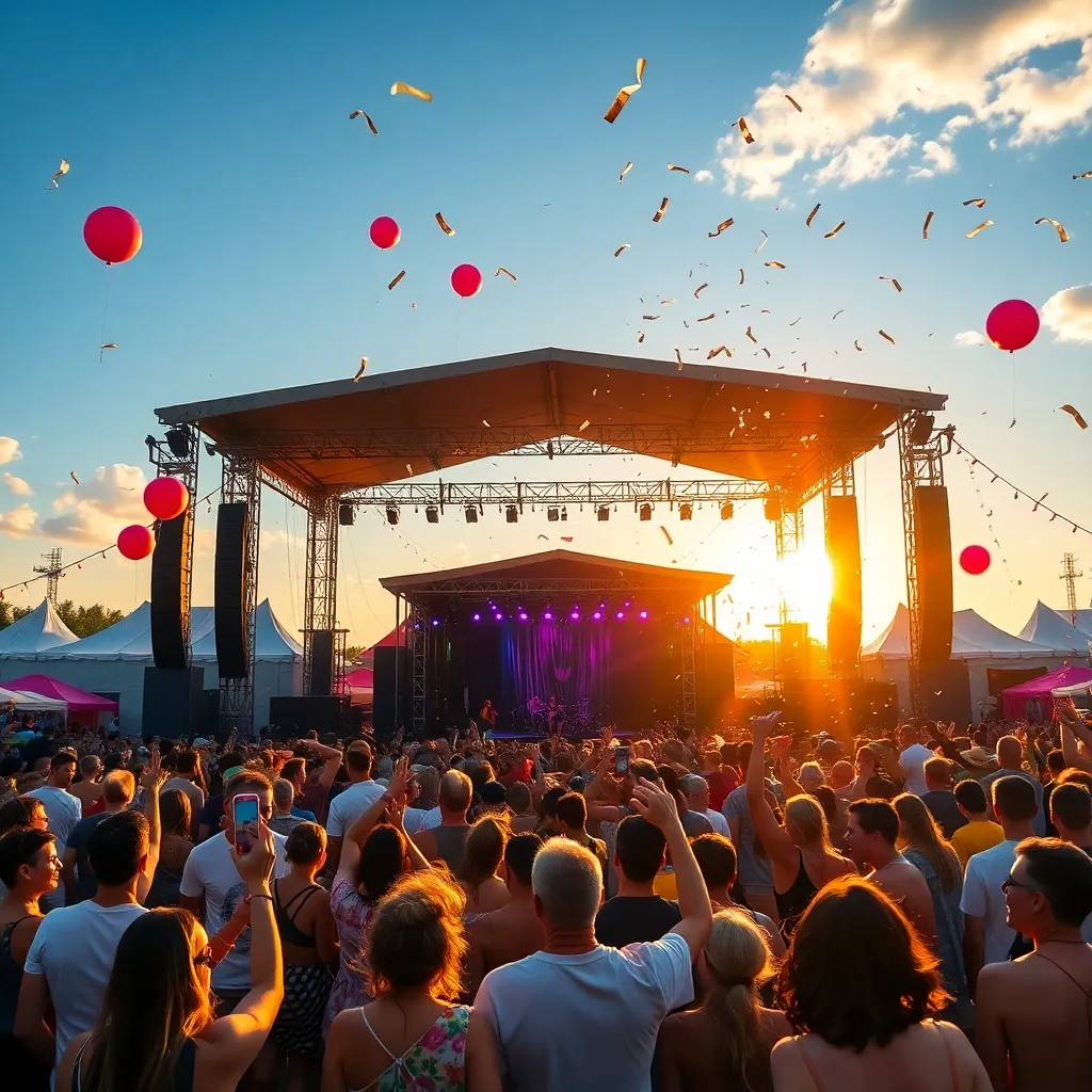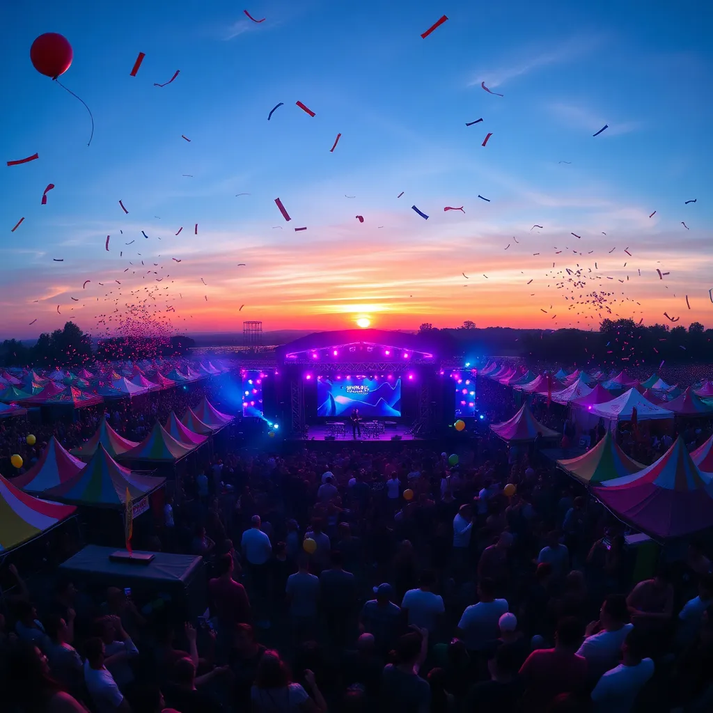 Create an AI-generated image of a vibrant music festival scene at sunset. The stage is set against a backdrop of rolling hills, with a crowd of diverse festival-goers dancing and singing along to a lively indie-rock band. Confetti and balloons fill the air, and a giant Ferris wheel glows in the distance.