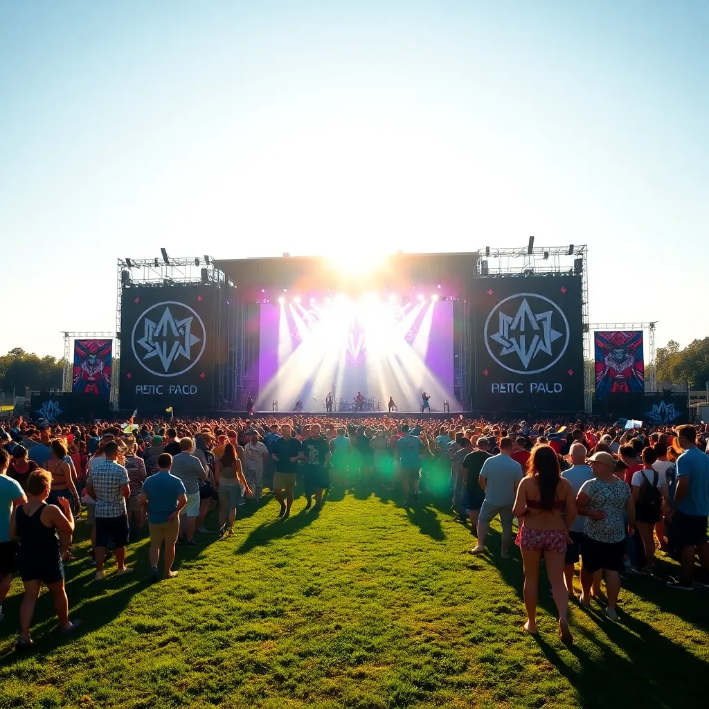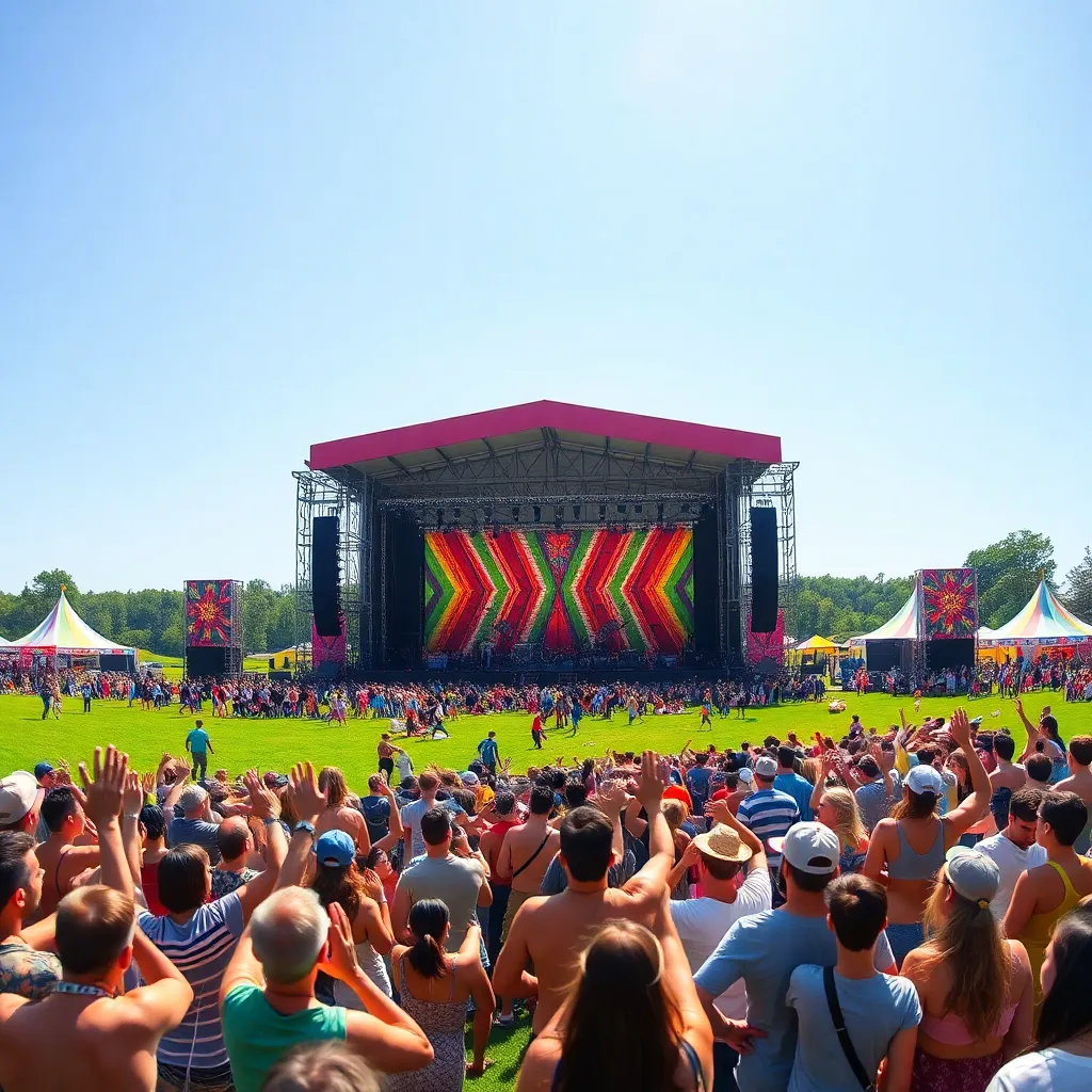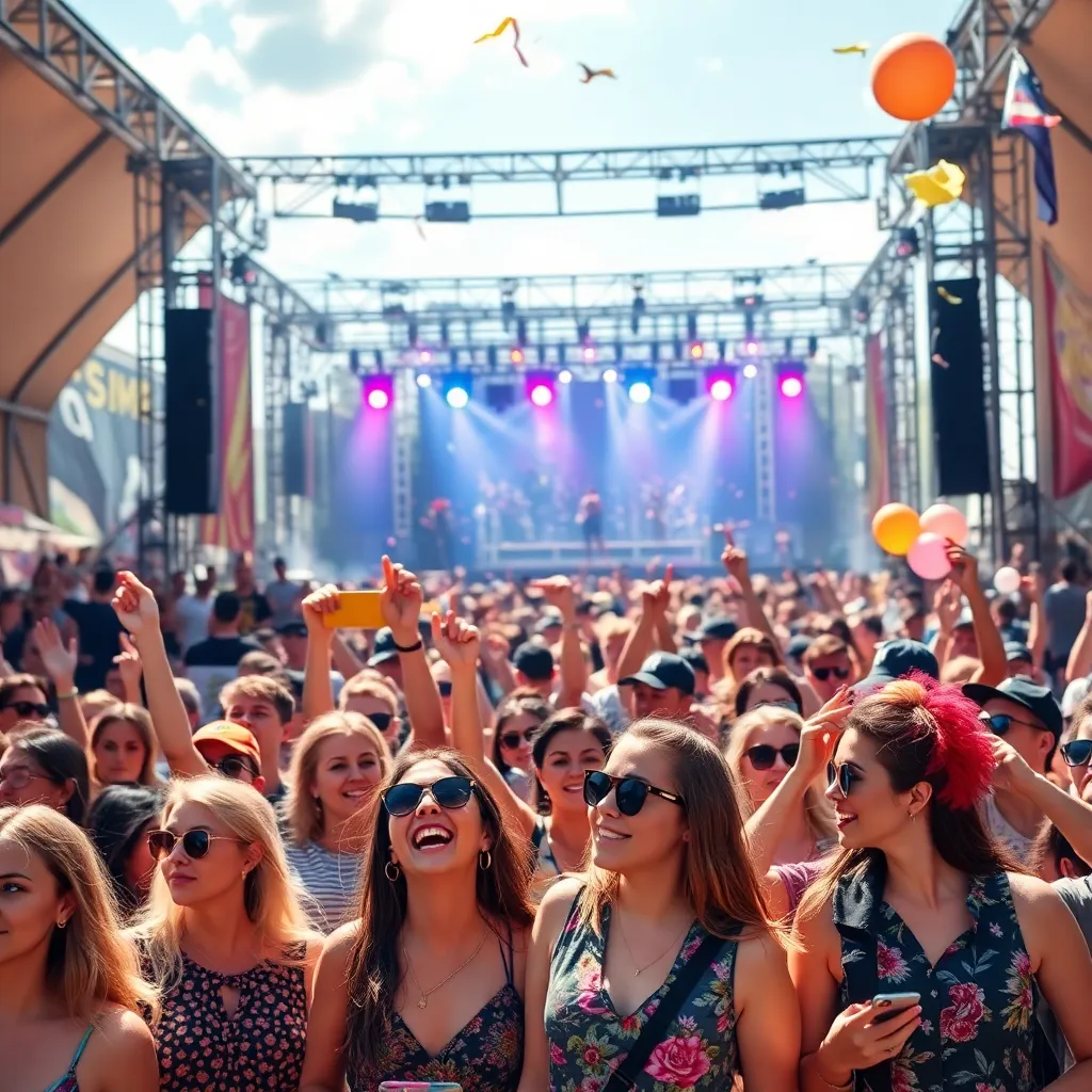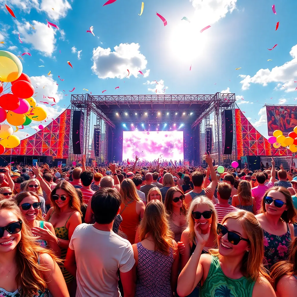 Capture the vibrant atmosphere of a summer music festival! Imagine a sunny day with a crowd of people dancing and singing along to their favorite artists. Incorporate colorful stage lights, confetti, and balloons. The main stage features a popular band, while food and drink vendors line the surrounding area.