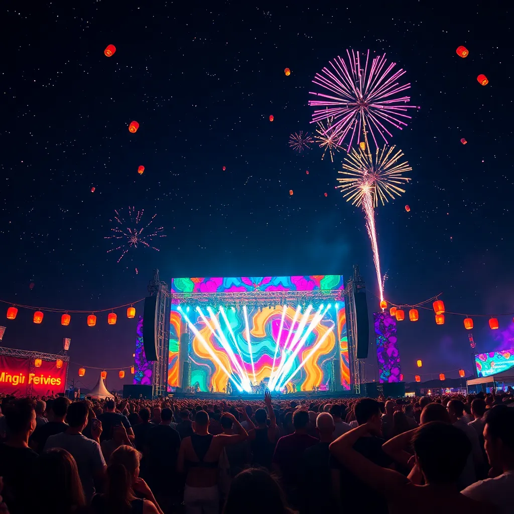 Imagine a vibrant music festival under the stars, with a psychedelic stage backdrop and a crowd of dancers and music lovers. The sky is filled with colorful lanterns and fireworks, while the sounds of indie rock and electronic beats fill the air. Create an AI image that captures the energy and excitement of this magical night.