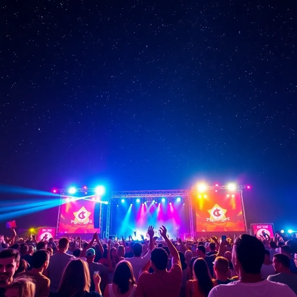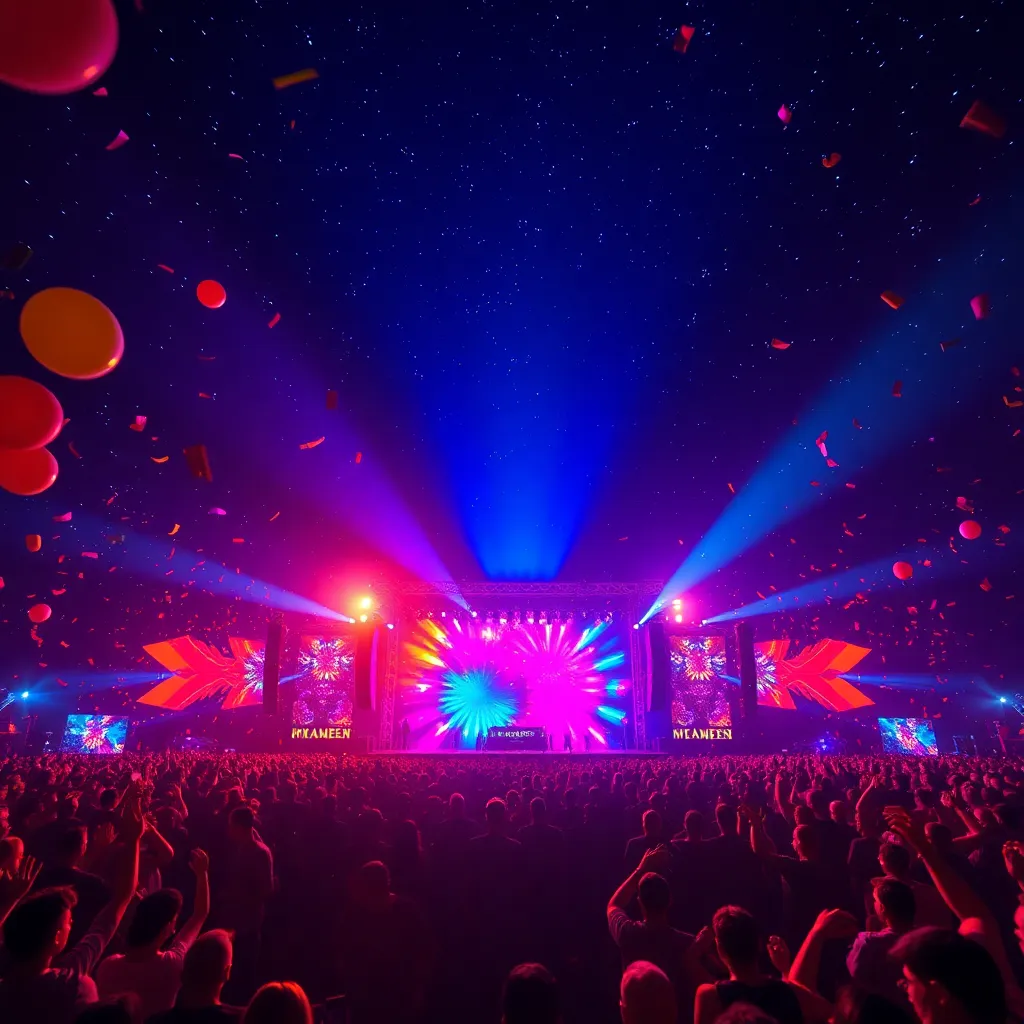 Imagine a vibrant music festival under a starry night sky. The main stage glows with a kaleidoscope of colors, surrounded by a sea of dancing crowd. Confetti and balloons fill the air as the DJ spins a hypnotic beat. Capture the electric atmosphere and mesmerizing lights in a stunning AI-generated image.