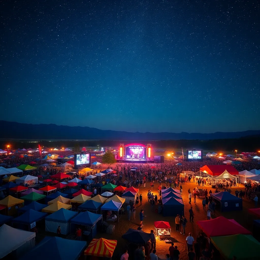 Imagine a vibrant music festival under the stars. A sprawling landscape of colorful tents, twinkling lights, and eclectic art installations. A diverse crowd of revelers, dressed in their best outfits, dance to the rhythm of indie rock, electronic beats, and folk melodies. Capture the electric atmosphere in a stunning AI-generated image.
