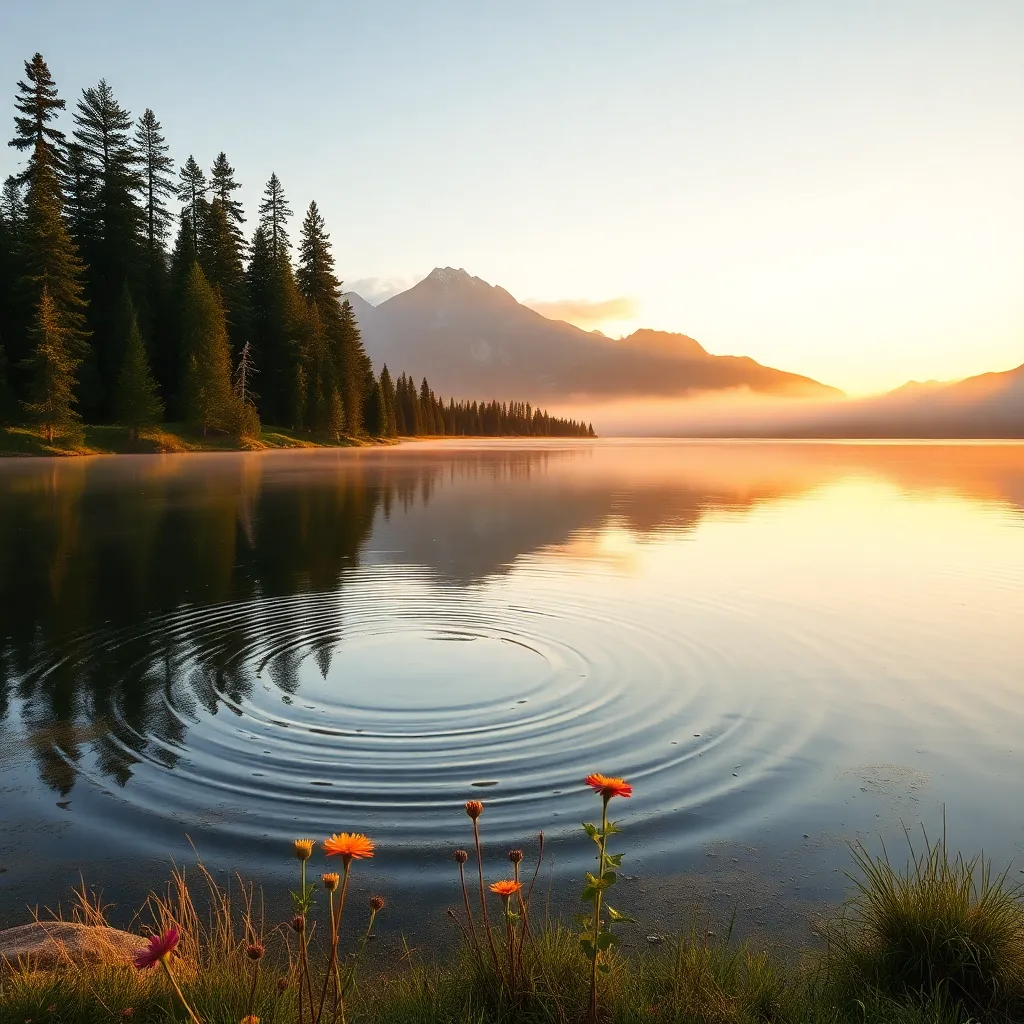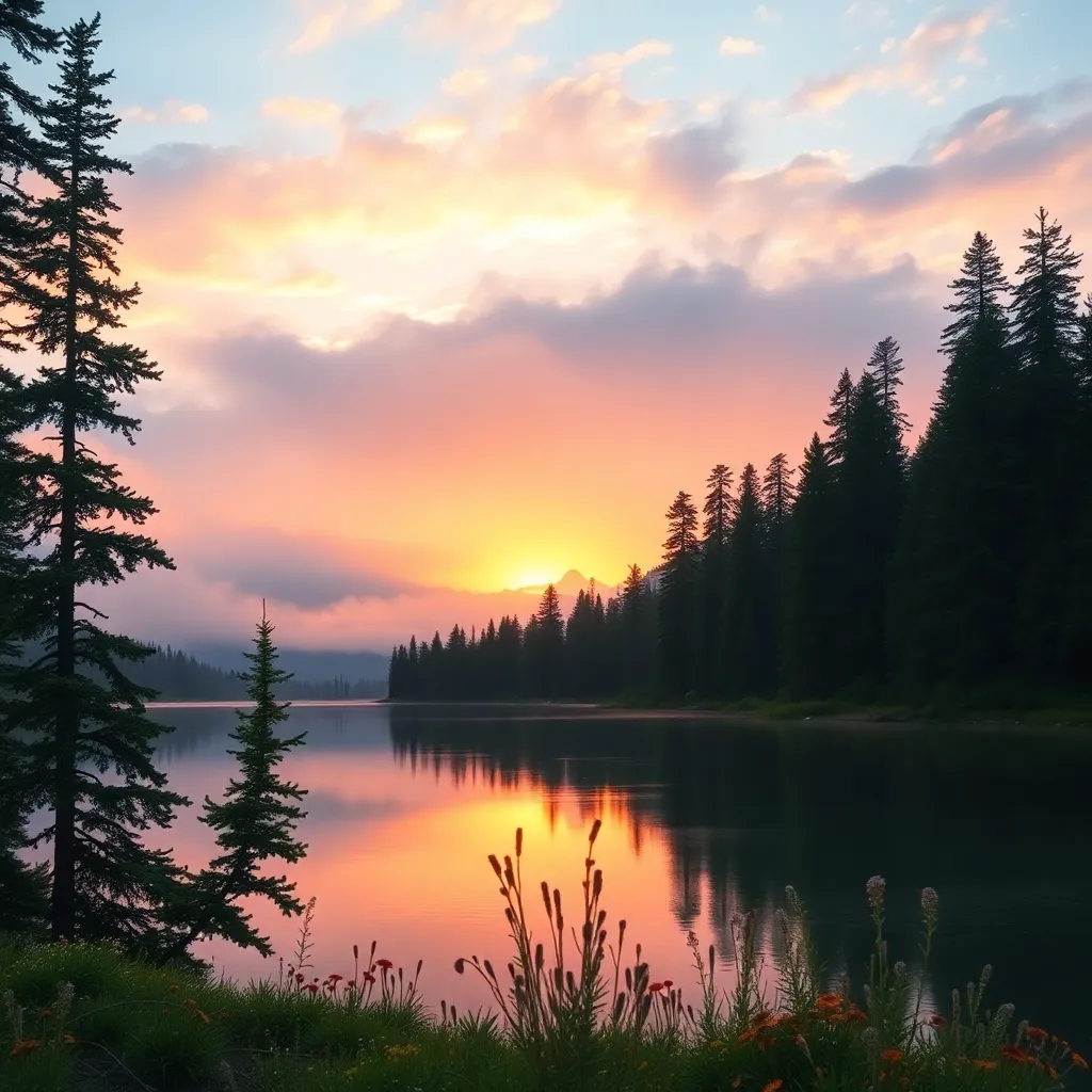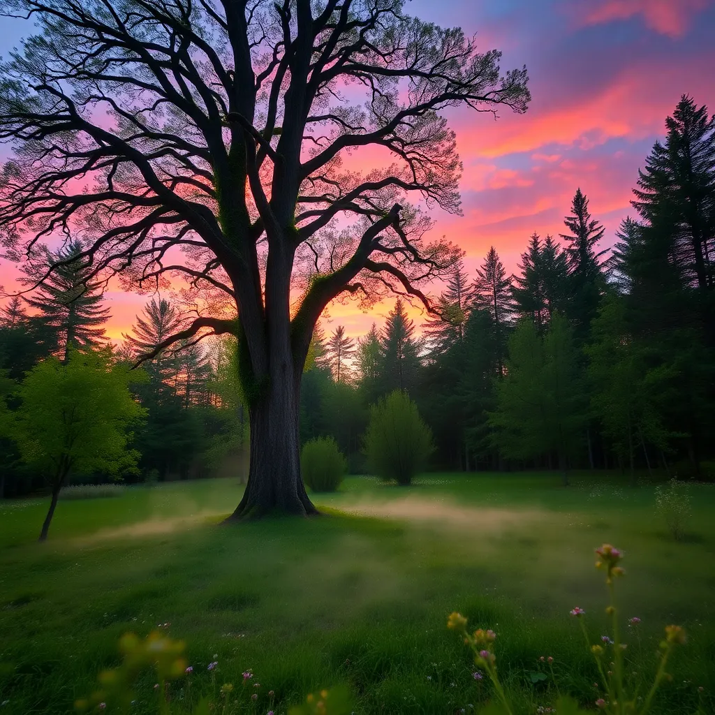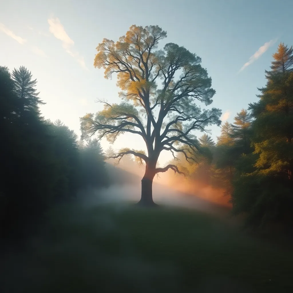Imagine a serene forest glade at dawn, with a misty veil lifting off the tranquil lake. A majestic tree, its branches adorned with twinkling fireflies, stands sentinel amidst a carpet of soft, emerald grass. The air is filled with the sweet scent of blooming wildflowers. Create an AI image of this idyllic scene.