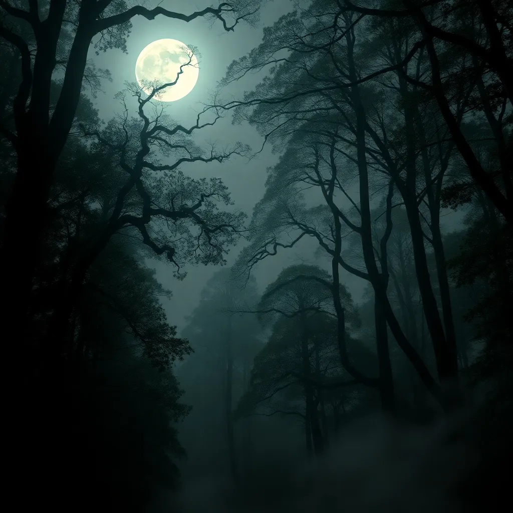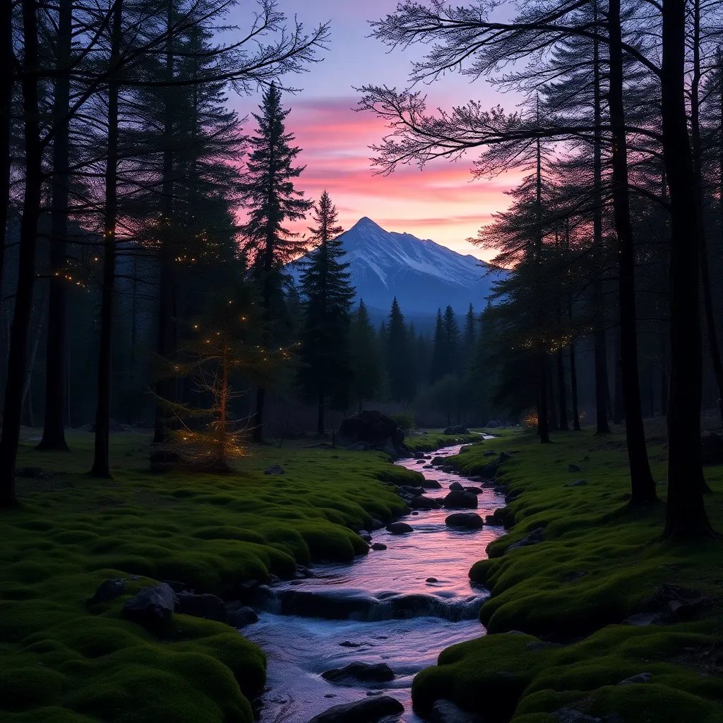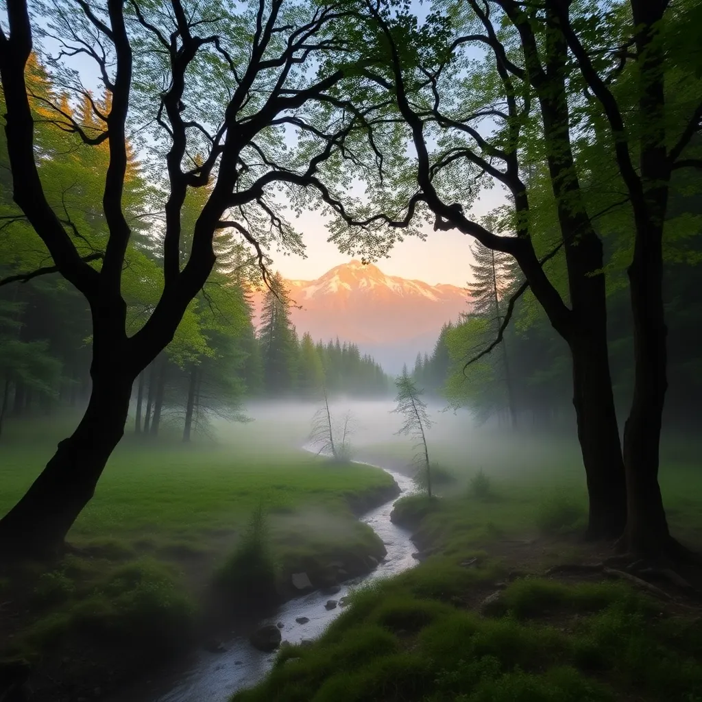 Imagine a serene forest glade at dawn, with a misty veil rising from the valley floor. A gentle stream meanders through the center, surrounded by towering trees with gnarled branches and vibrant green leaves. In the distance, a majestic mountain range stretches towards the sky, its peaks still capped with snow.