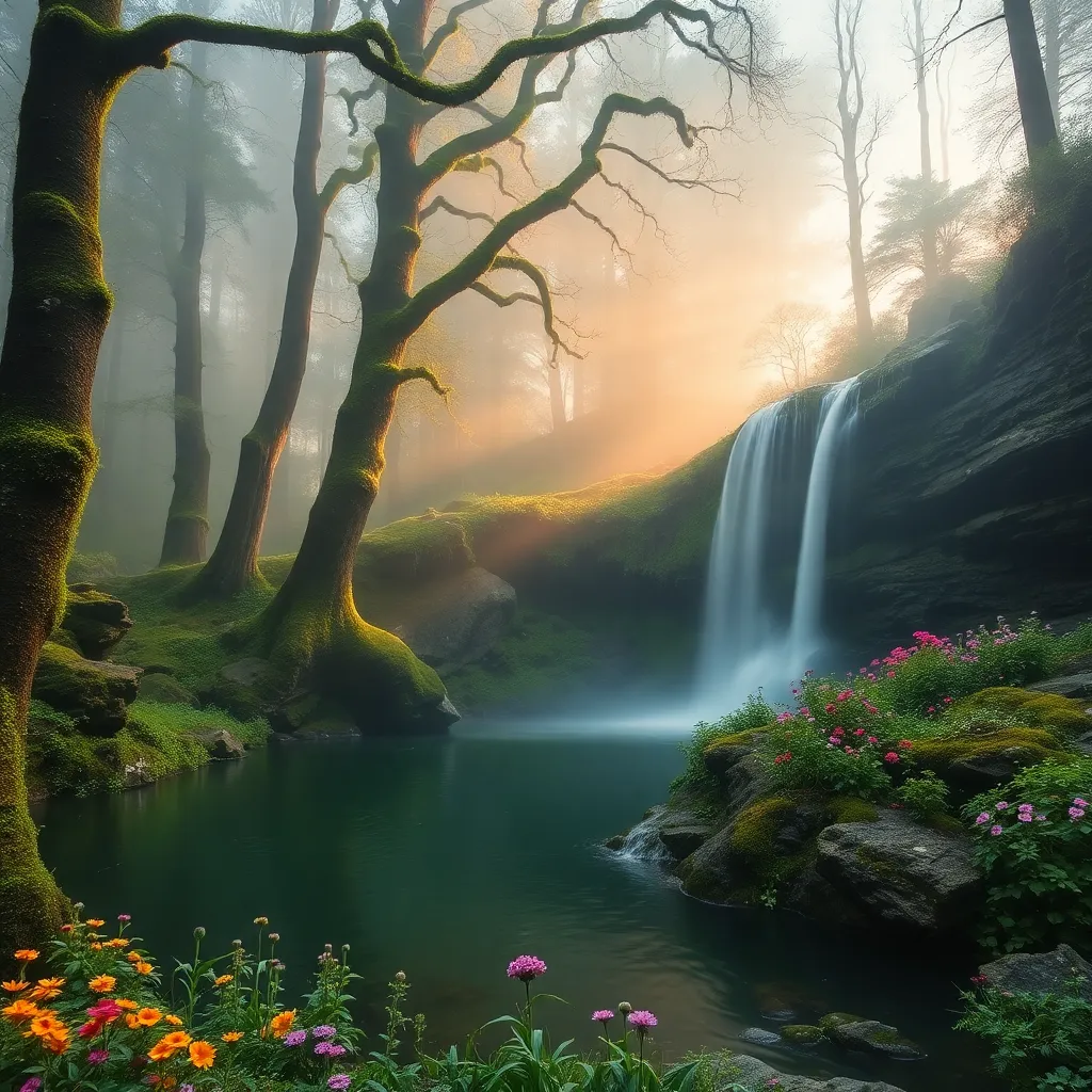Create an image of a serene misty forest, with towering trees adorned with vibrant green moss and delicate ferns. A gentle stream runs through the center, reflecting the misty atmosphere. In the background, a majestic waterfall cascades down a rocky cliff, surrounded by lush greenery and colorful wildflowers.