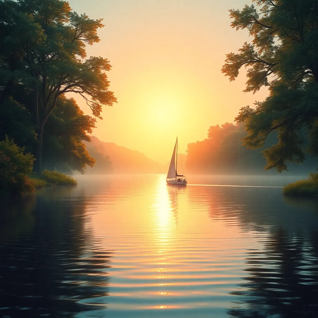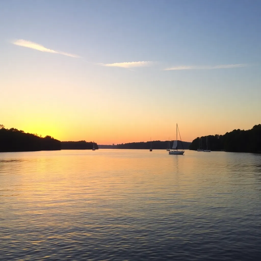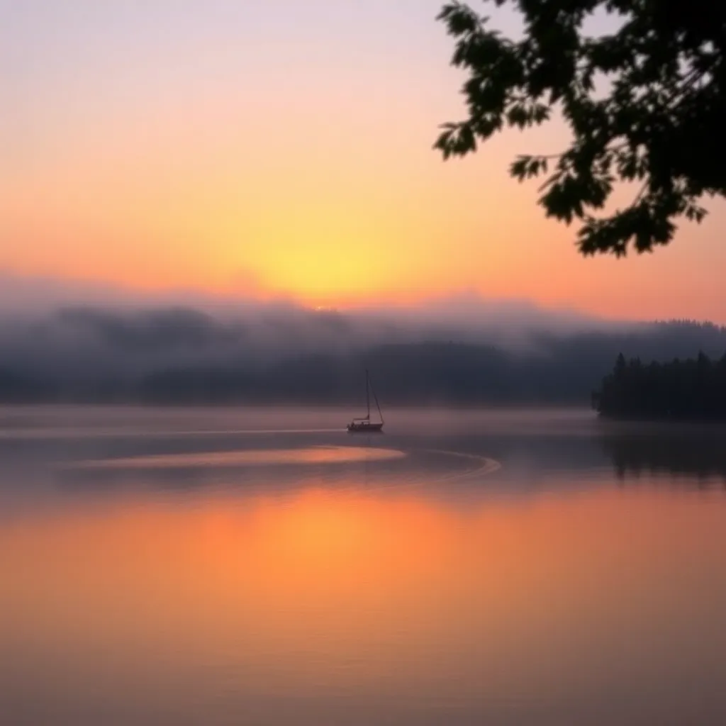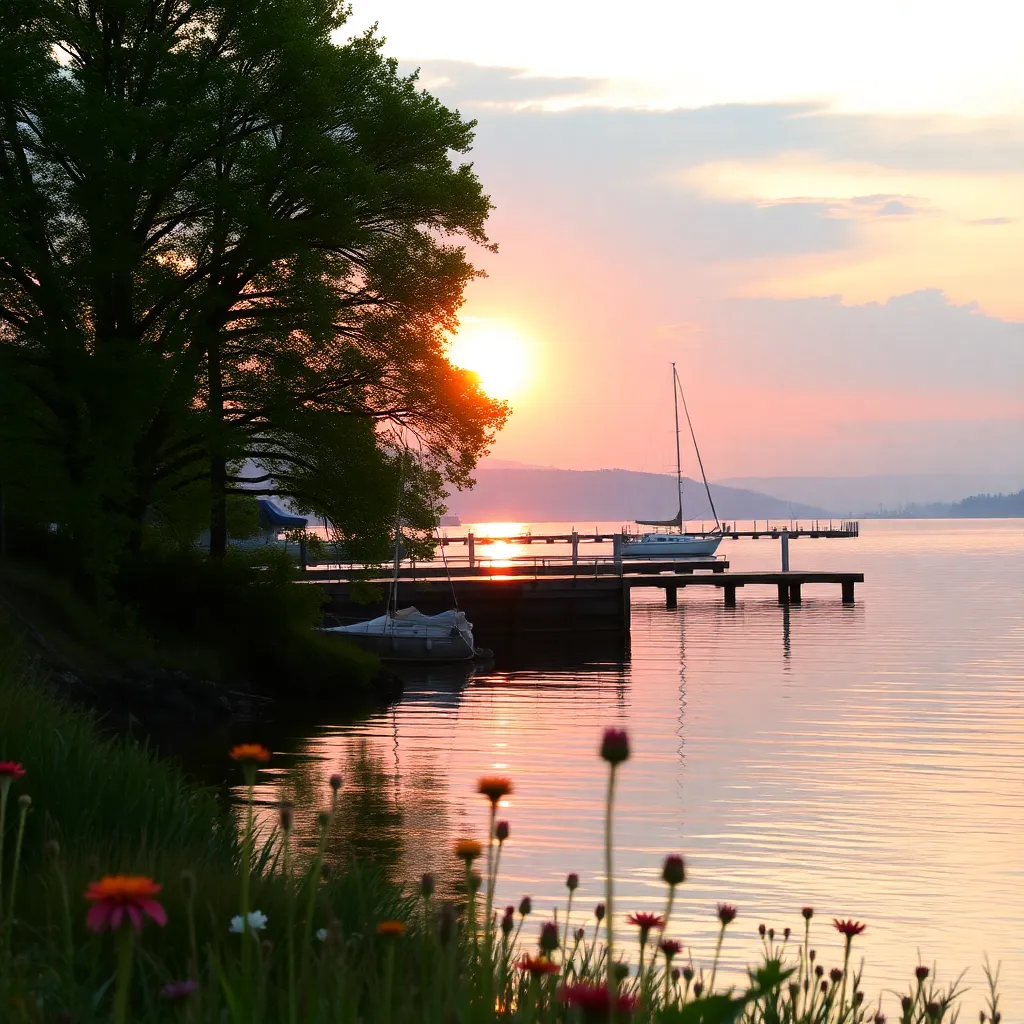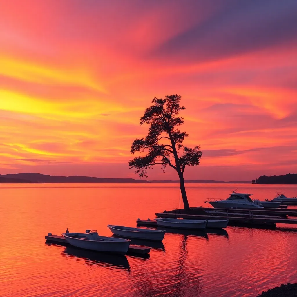 Create an AI-generated image of a serene sunset on a tranquil lake, with the sky painted in warm hues of orange, pink, and purple. The lake's surface is calm, reflecting the vibrant colors of the sky. A few boats are docked, and a lone tree stands tall on the shore, its branches stretching towards the sky.
