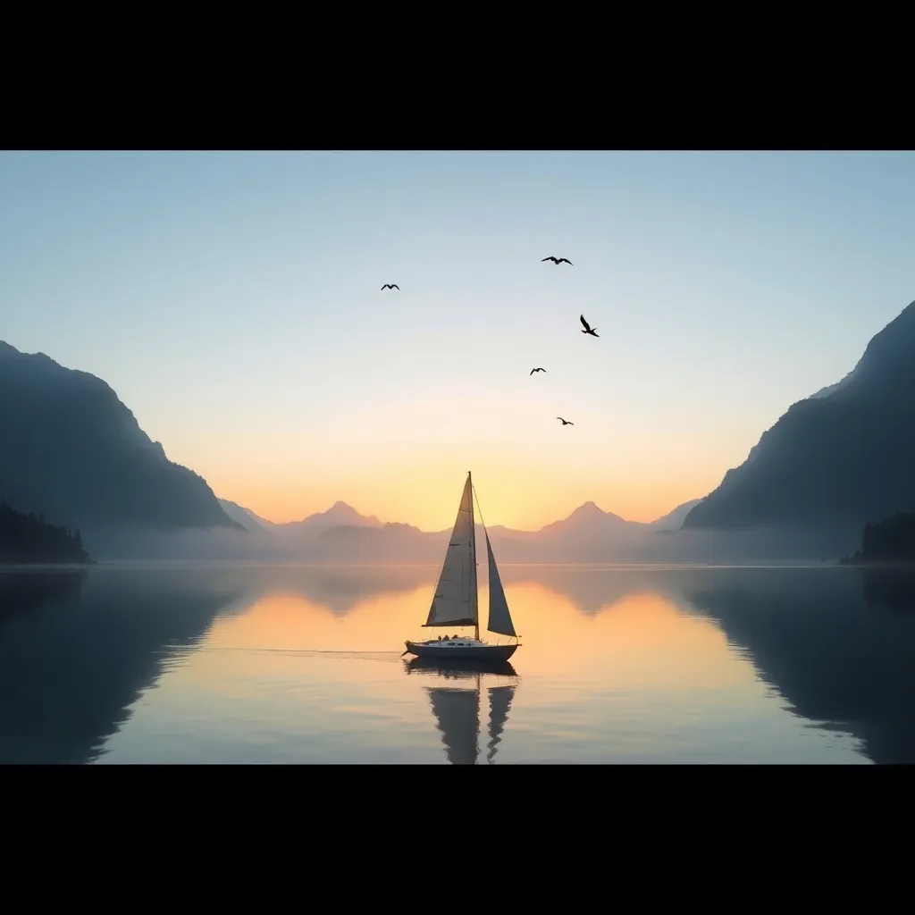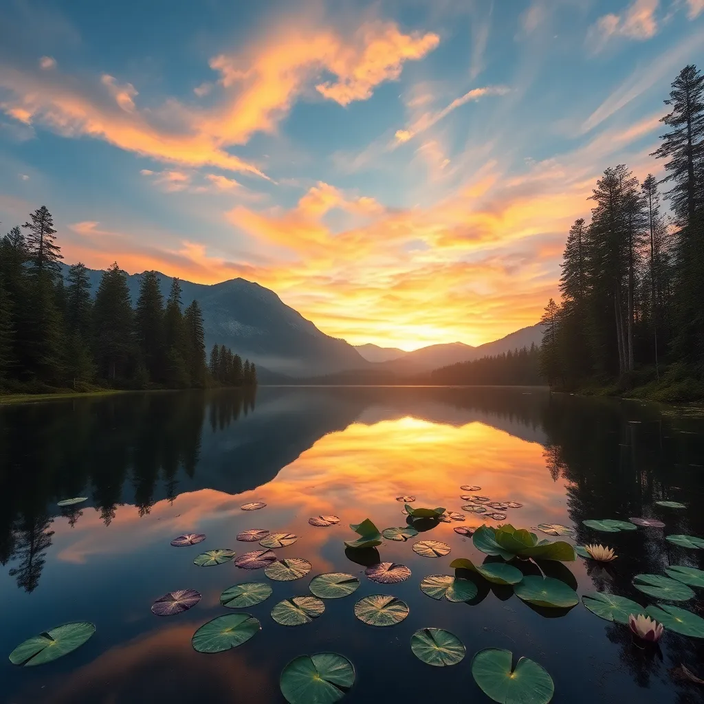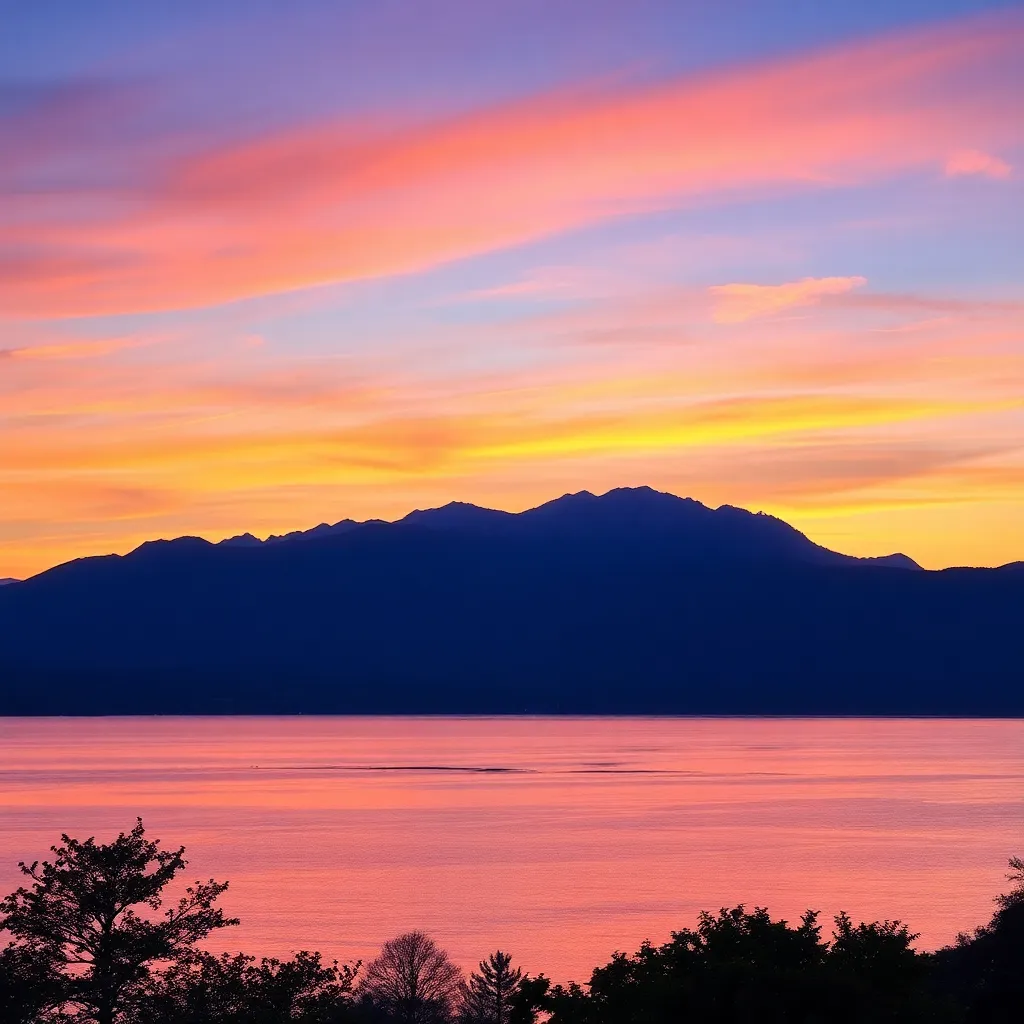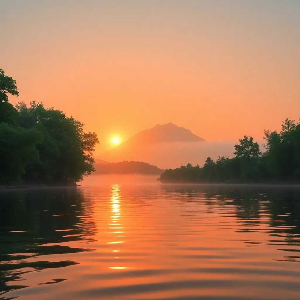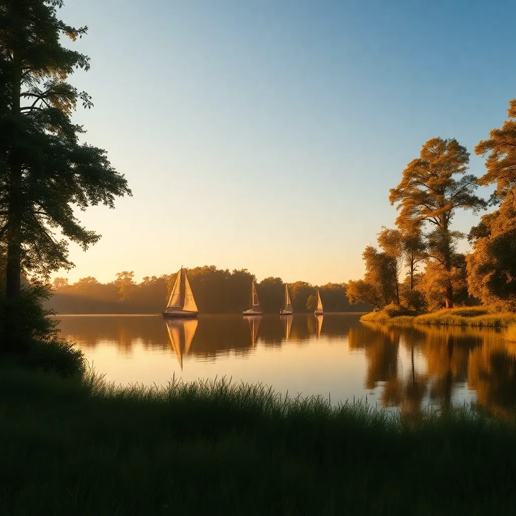Create an AI-generated image of a serene sunset on a tranquil lake, with the sky painted in warm hues of orange, pink, and purple. The lake's surface is calm, reflecting the vibrant colors of the sky. A few boats are docked, and a lone tree stands tall on the shore, its branches stretching towards the sky.