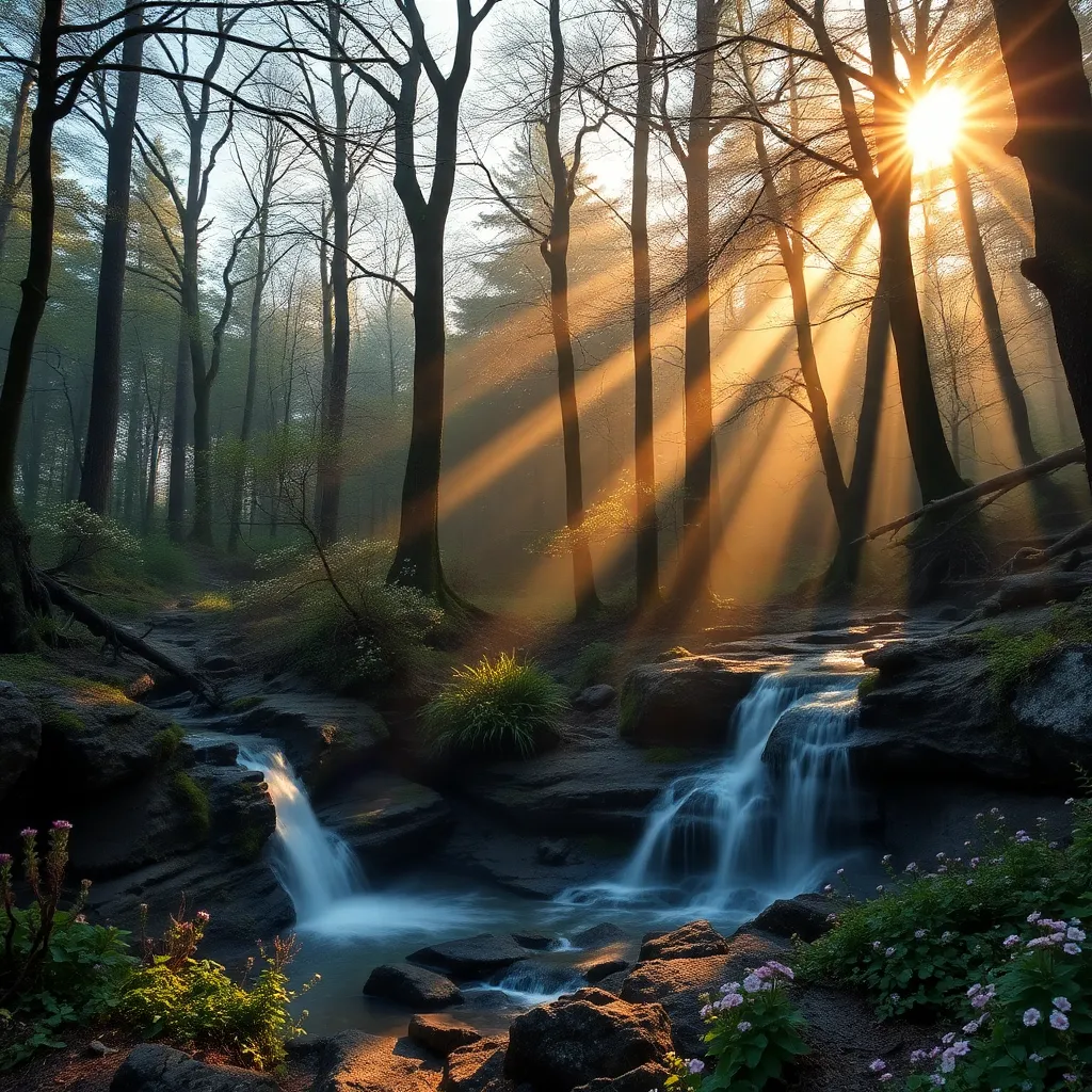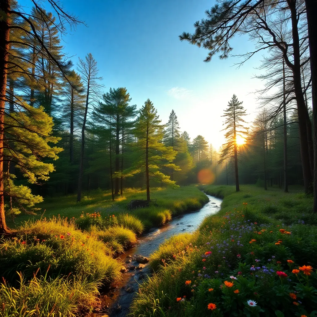 Envision a serene misty forest at dawn, with towering trees adorned with vibrant green moss and delicate wildflowers. A gentle stream babbles in the background, its crystal-clear water reflecting the warm golden light of the rising sun. Create an image that captures the peaceful essence of this mystical scene.