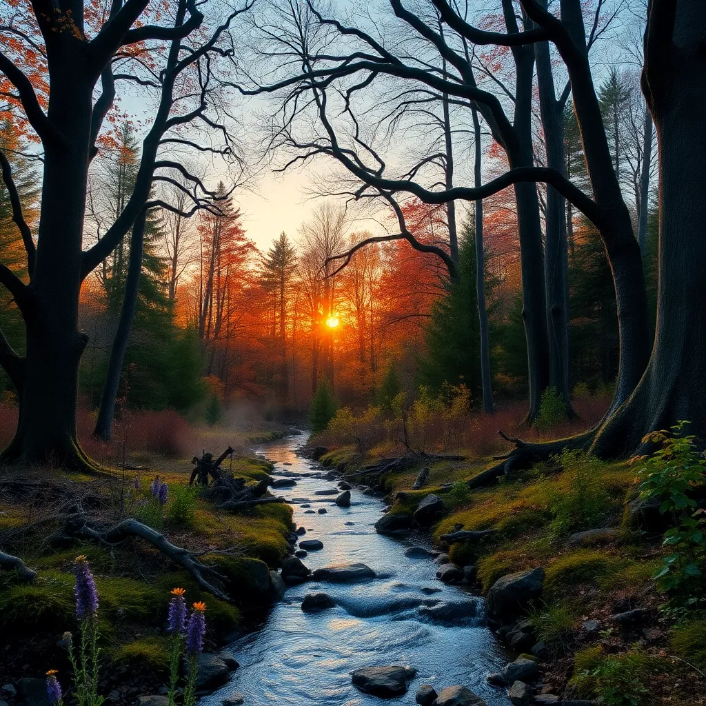 Create an image of a serene forest glade at sunset. A gentle stream runs through the center, surrounded by towering trees with gnarled branches and vibrant autumn foliage. A few wildflowers bloom amidst the underbrush, and a misty veil rises from the forest floor, capturing the peaceful atmosphere of nature.