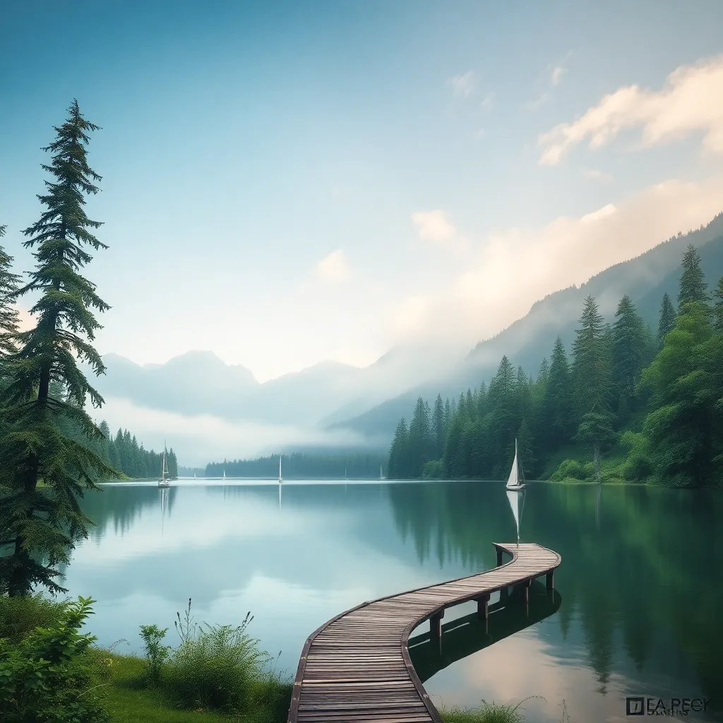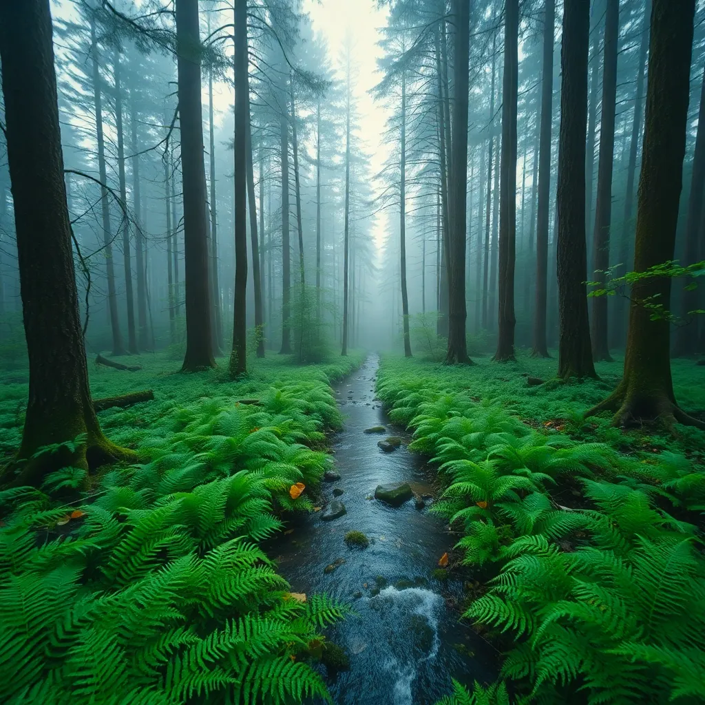 Imagine a serene misty forest at dawn, with towering trees stretching towards the sky and a carpet of emerald ferns beneath. A gentle stream runs through the center, its crystal clear waters reflecting the vibrant hues of the surrounding foliage. The atmosphere is peaceful, with a hint of morning dew.