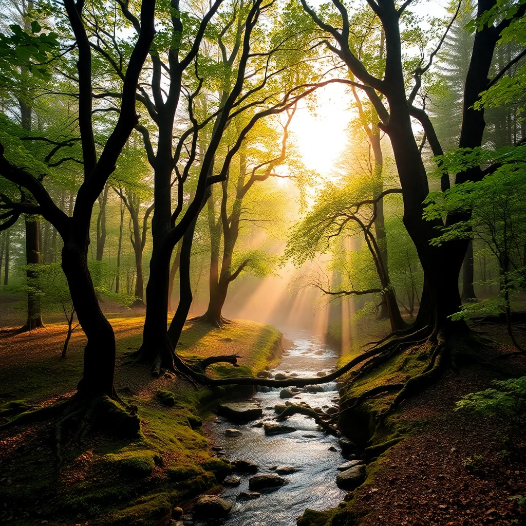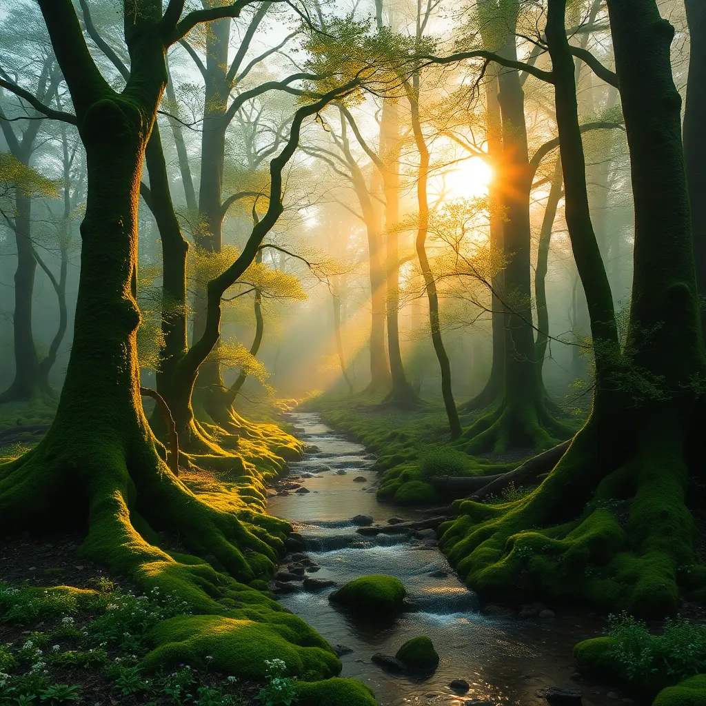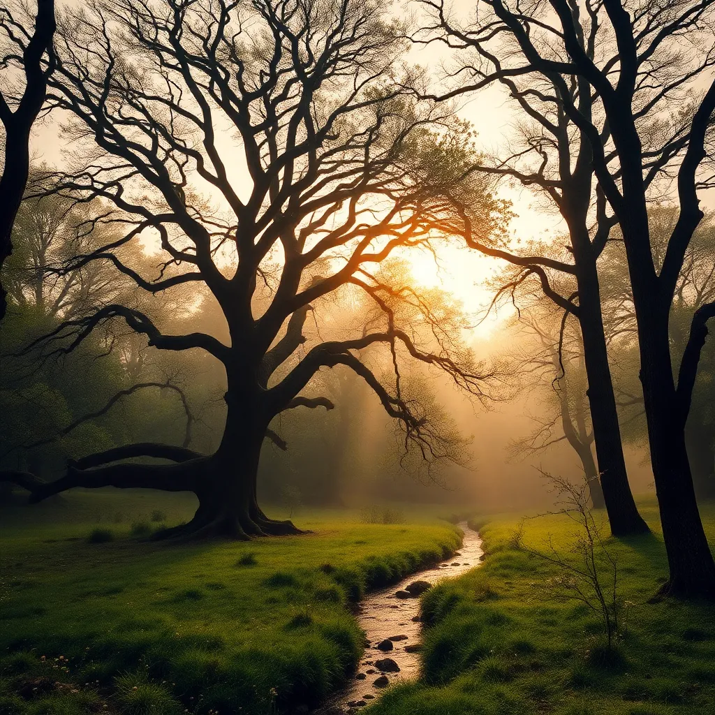 Imagine a serene forest glade at dawn, where a gentle mist rises from the earth and a warm golden light filters through the canopy above. A babbling brook flows softly through the center, surrounded by towering trees with gnarled branches and vibrant green leaves. Capture the peaceful essence of this idyllic scene.