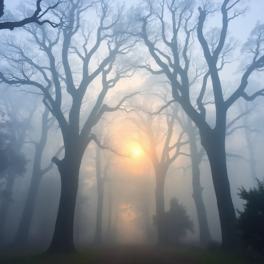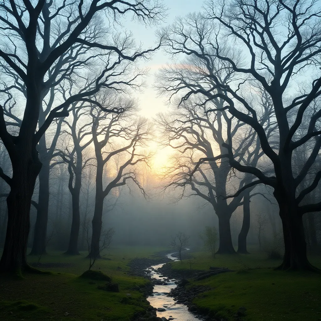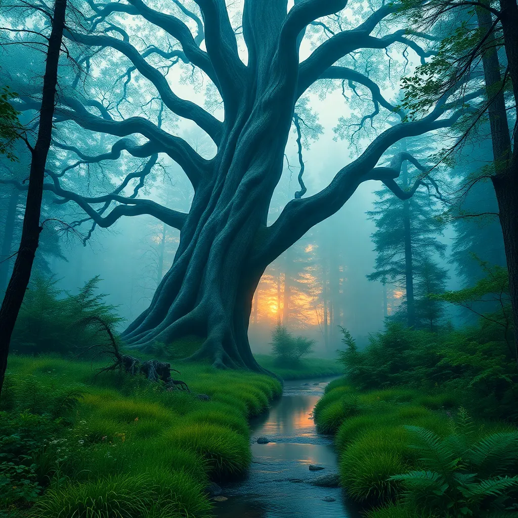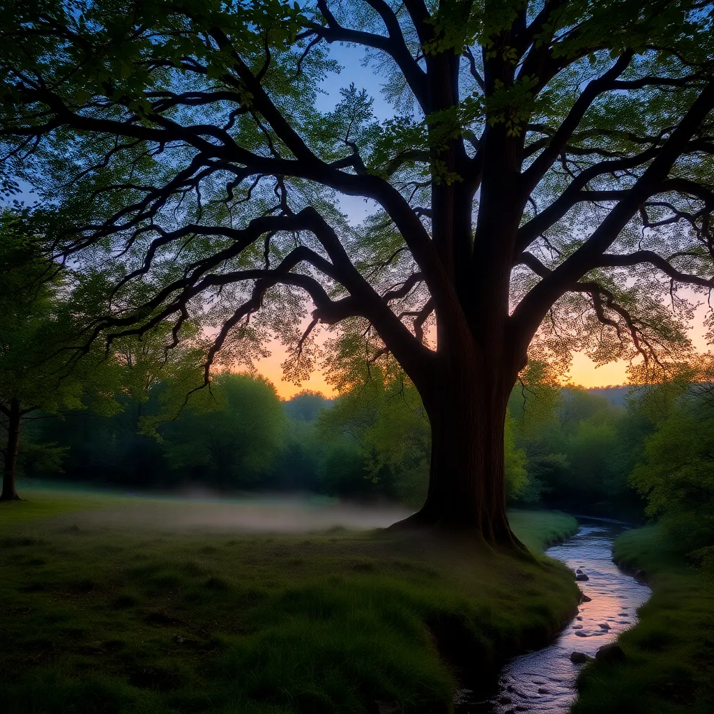 Imagine a serene forest glade at dawn, where a gentle mist rises from the earth and a warm golden light filters through the canopy above. A babbling brook flows softly through the center, surrounded by towering trees with gnarled branches and vibrant green leaves. Capture the peaceful essence of this idyllic scene.