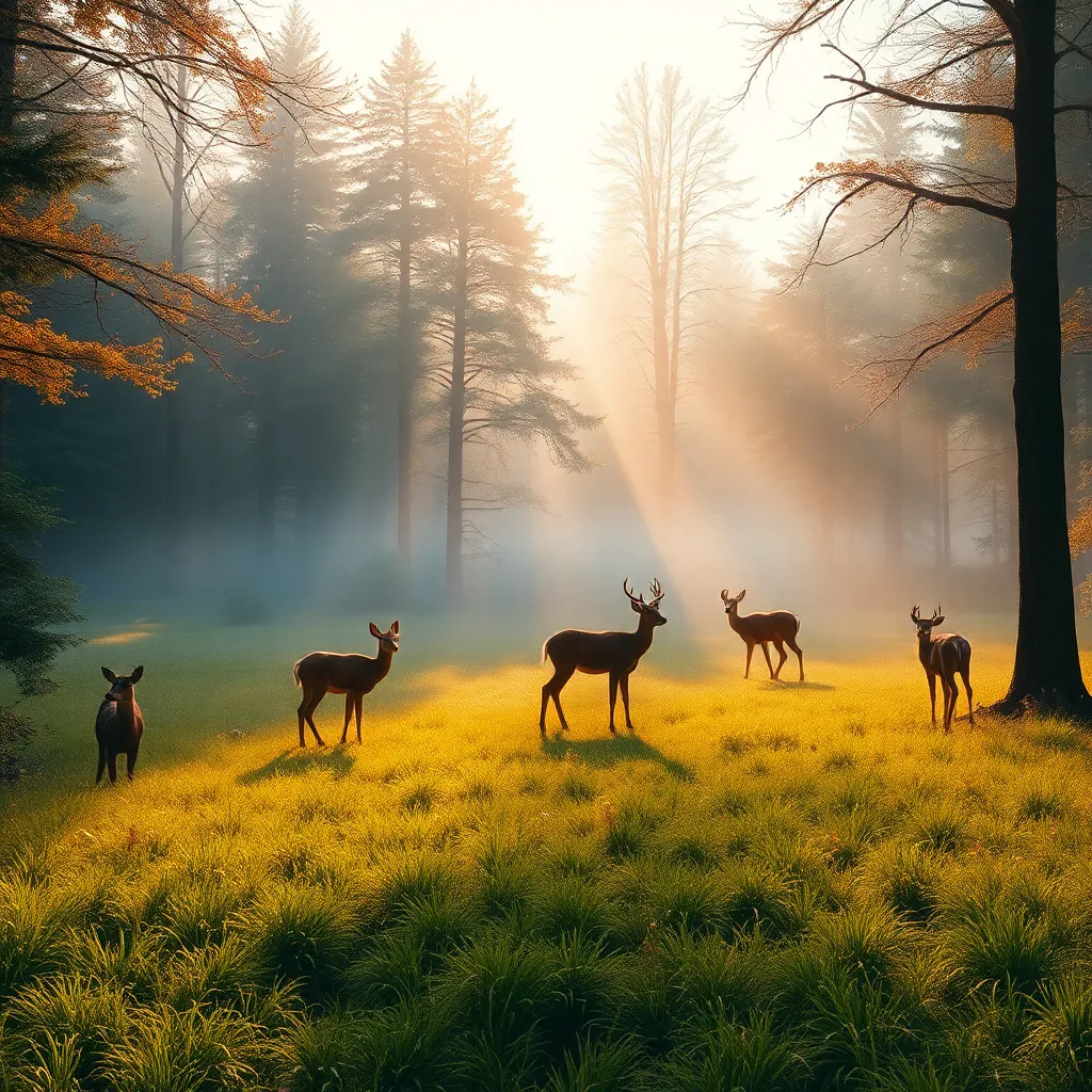 Imagine a serene forest glade at dawn, where a gentle mist rises from the dewy grass and a family of deer grazes peacefully. Incorporate vibrant colors, soft lighting, and intricate textures to capture the tranquility of this idyllic scene. Create an AI image that transports viewers to a haven of peace.