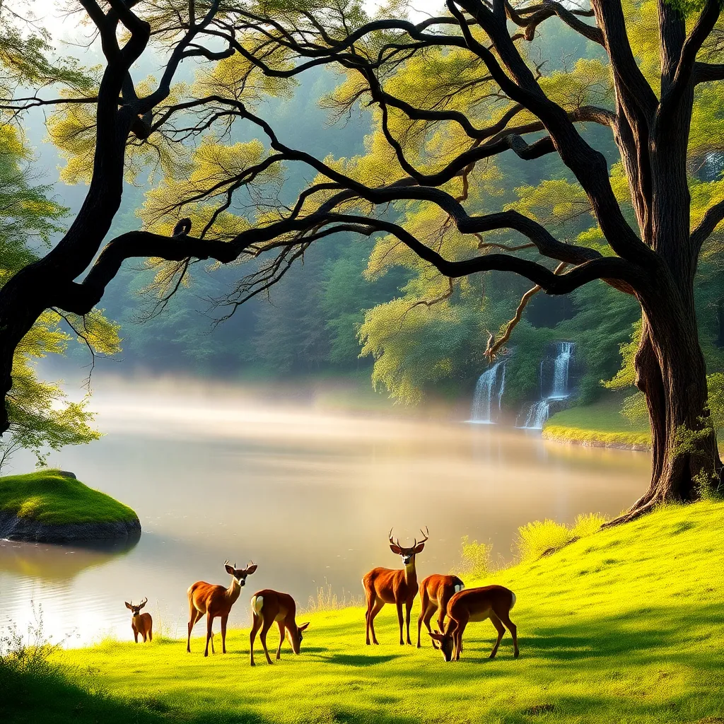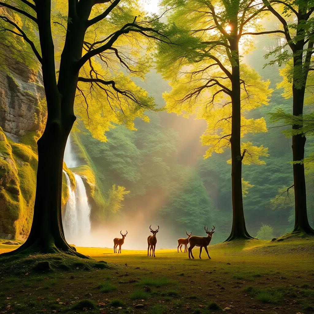 Imagine a serene forest glade at dawn, with a misty waterfall cascading down a moss-covered rock face. A family of deer grazes peacefully in the clearing, surrounded by towering trees with vibrant green leaves and a warm, golden light filtering through the canopy. Generate an AI image that captures this idyllic scene.
