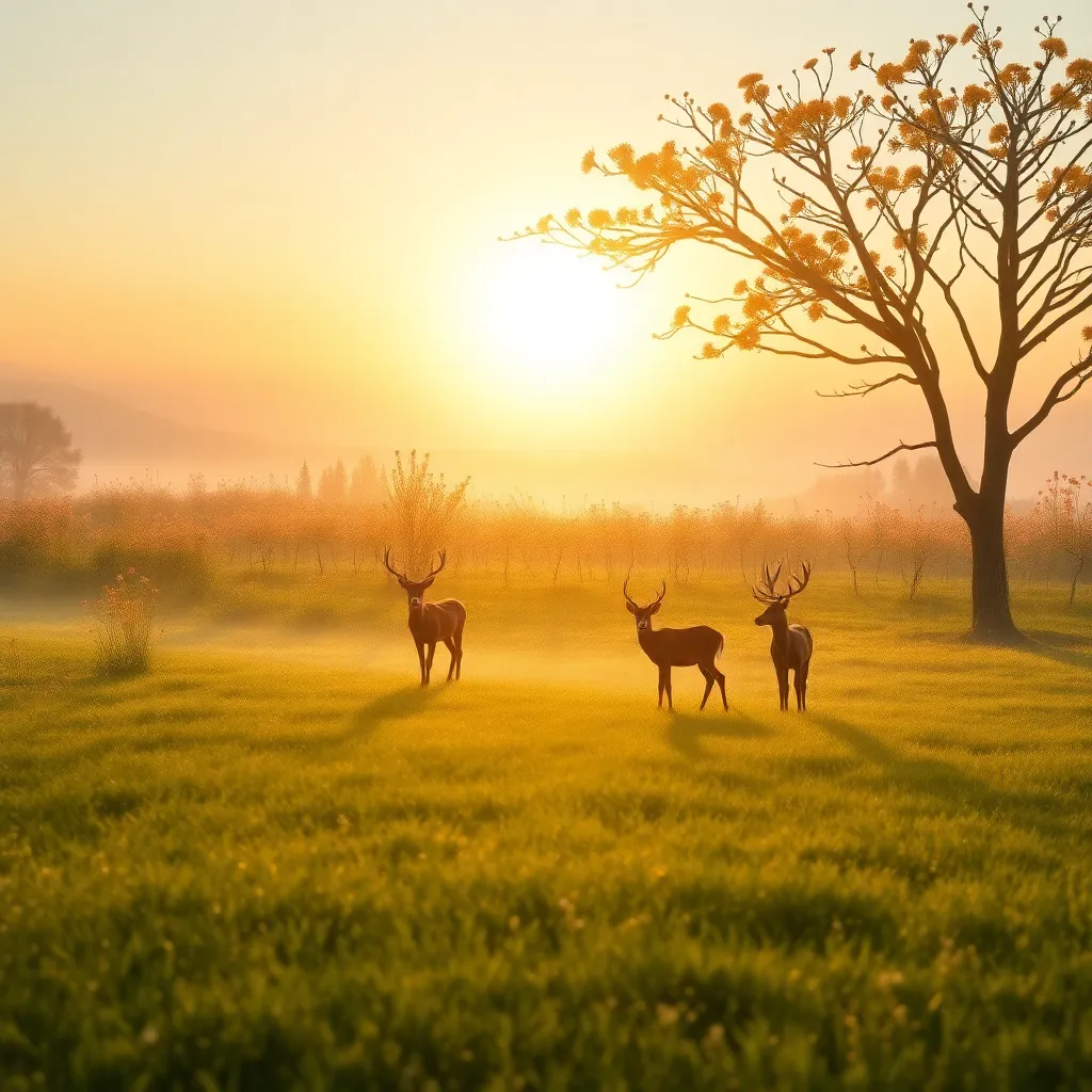 Imagine a serene meadow at dawn, where a gentle mist rises from the dewy grass, and a family of deer graze peacefully beneath a canopy of vibrant wildflowers. The warm sunlight casts a golden glow, illuminating the scene with a soft, ethereal light. Generate an AI image that captures this idyllic moment.