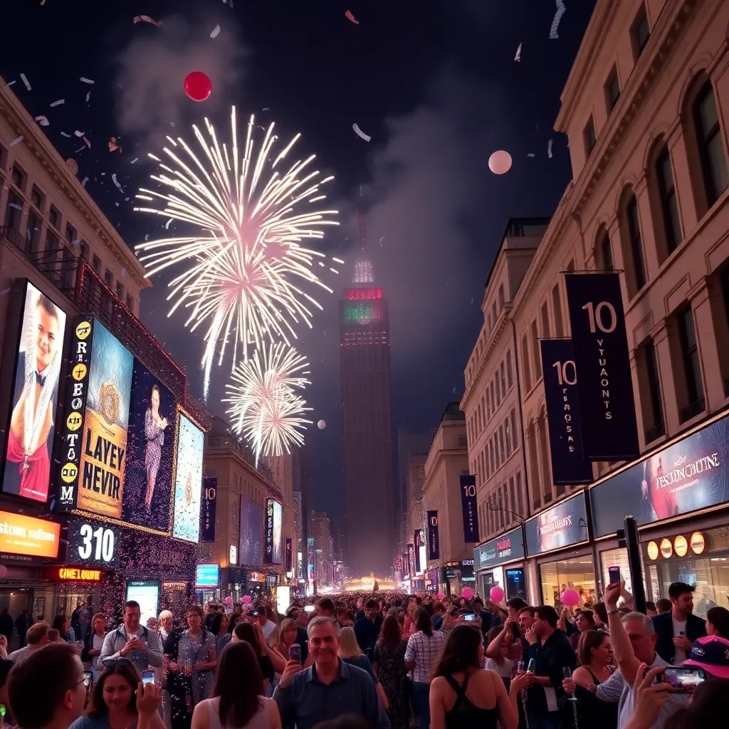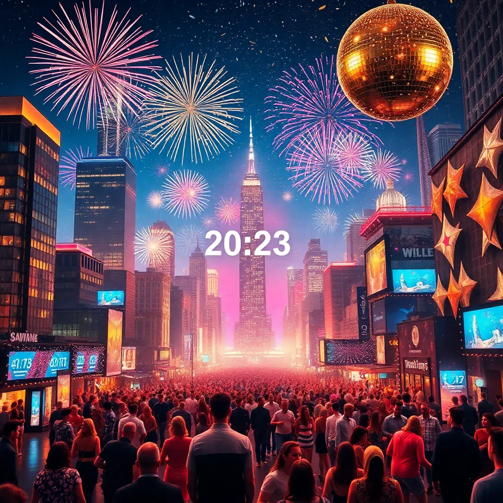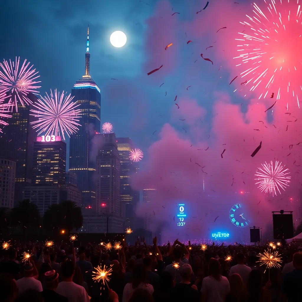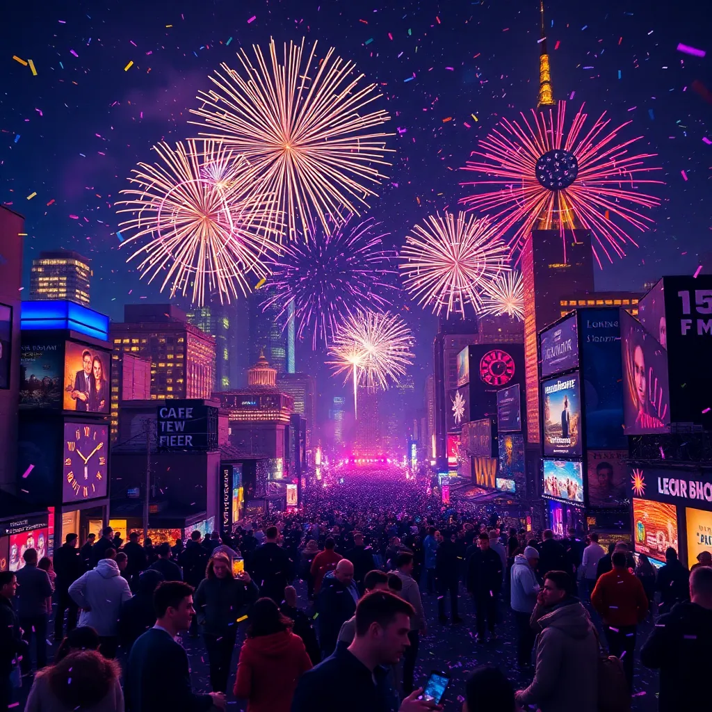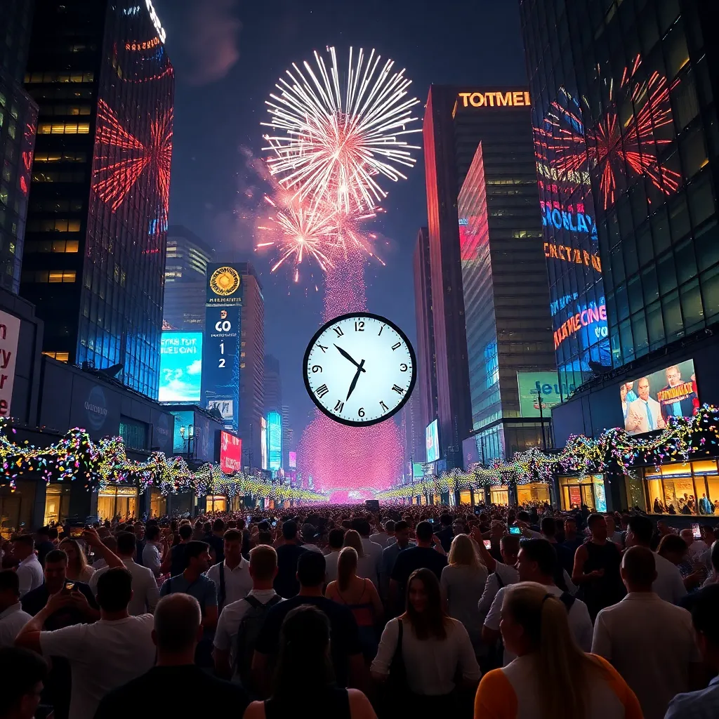 As the clock strikes midnight, a mesmerizing fireworks display illuminates the night sky above a bustling city square. Confetti and balloons swirl around joyful revelers, while a giant digital countdown timer hangs suspended above the scene. The air is electric with anticipation and celebration on this magical New Year's Eve.