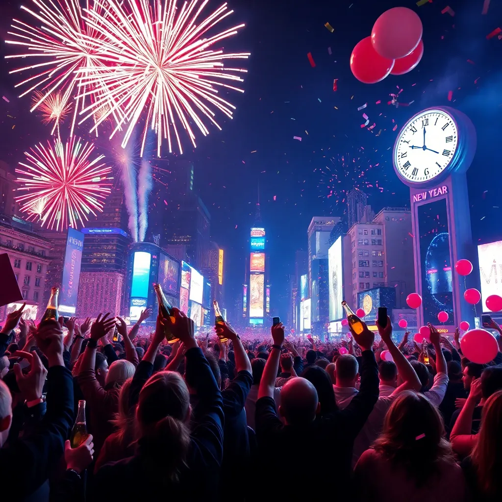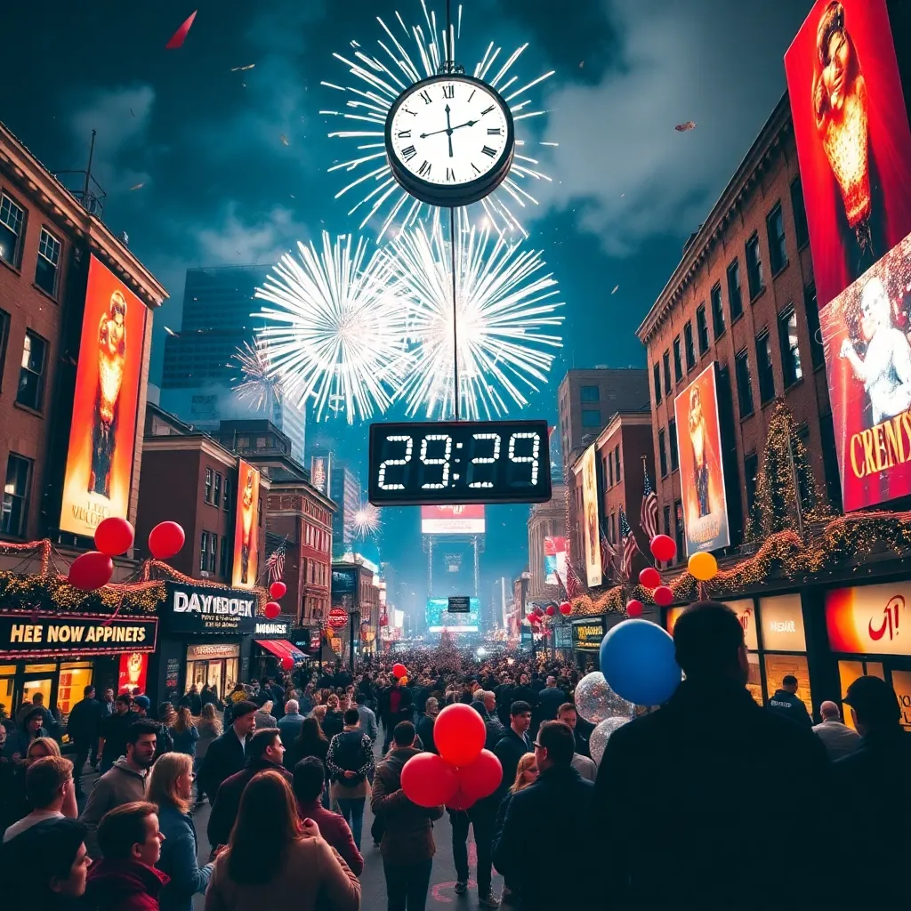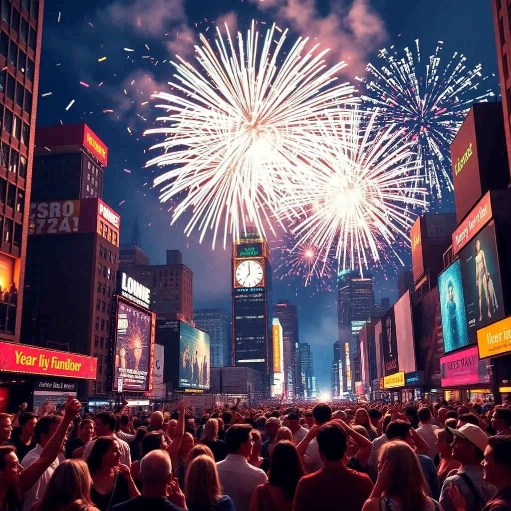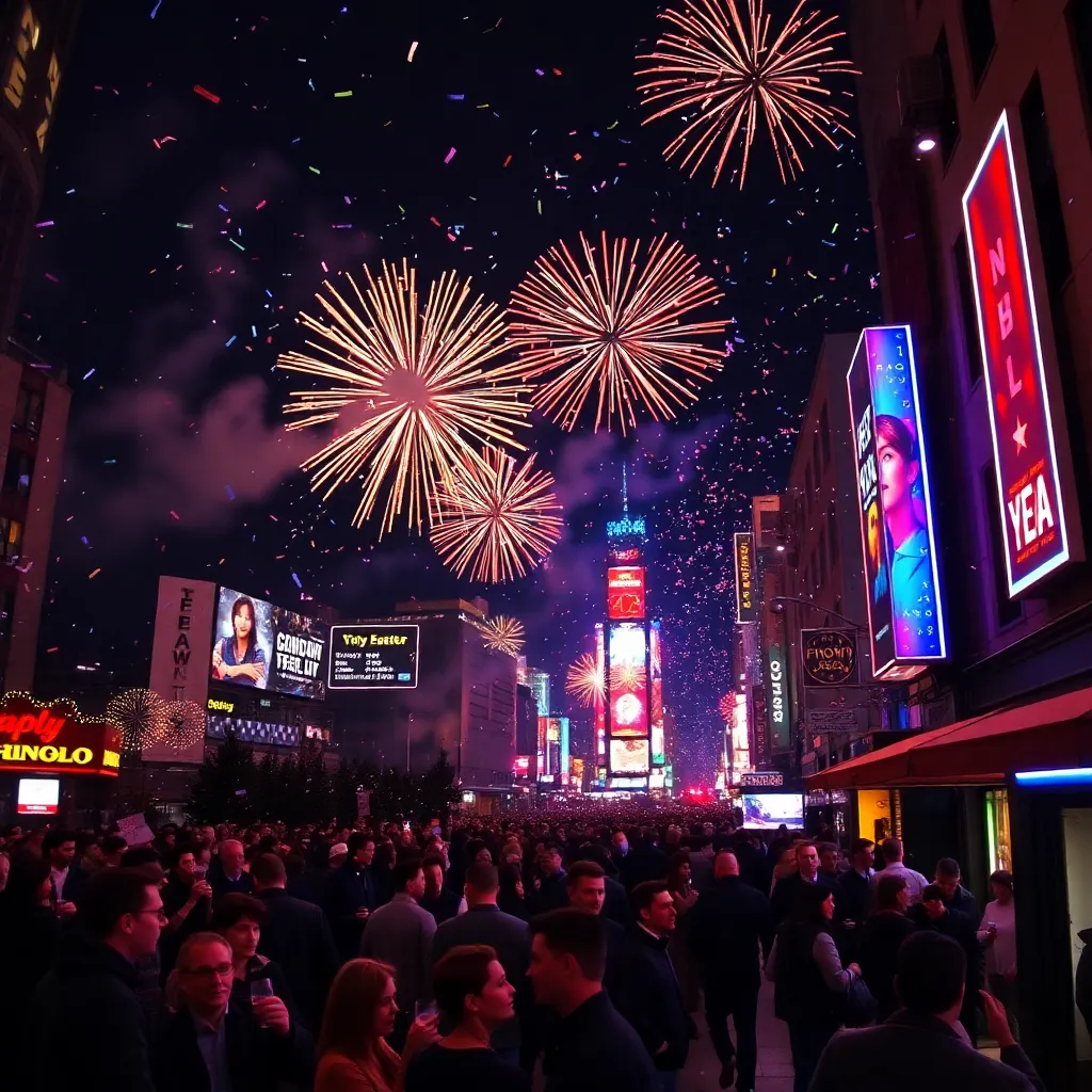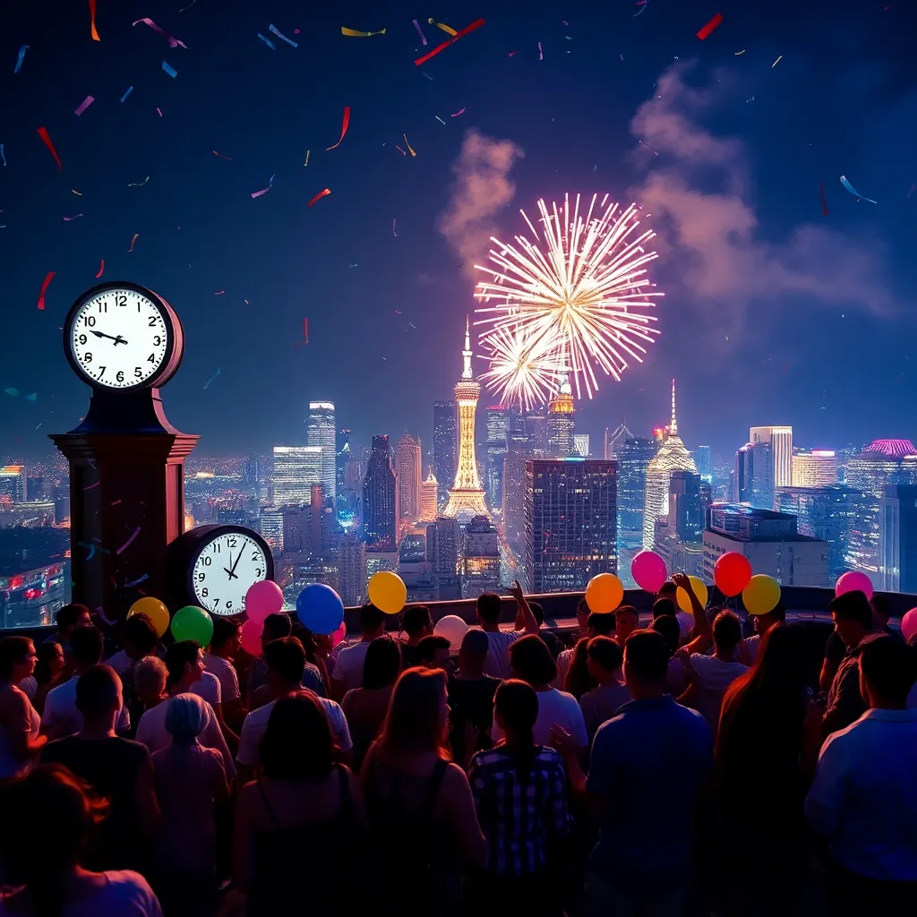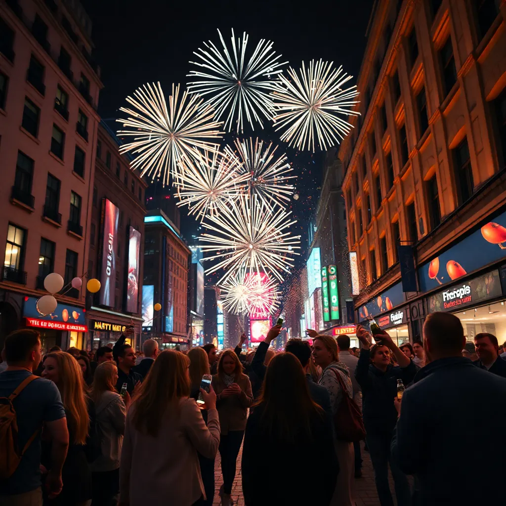 As the clock strikes midnight, a mesmerizing fireworks display illuminates the night sky above a bustling city square. Confetti and balloons swirl around joyful revelers, while a giant digital countdown timer hangs suspended above the scene. The air is electric with anticipation and celebration on this magical New Year's Eve.