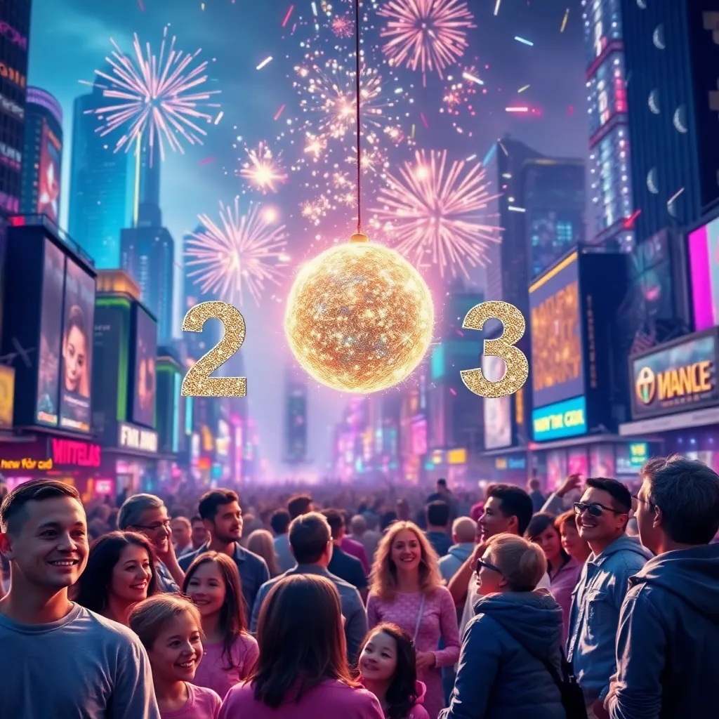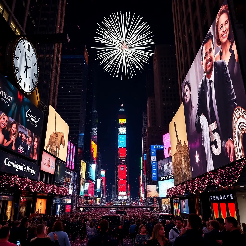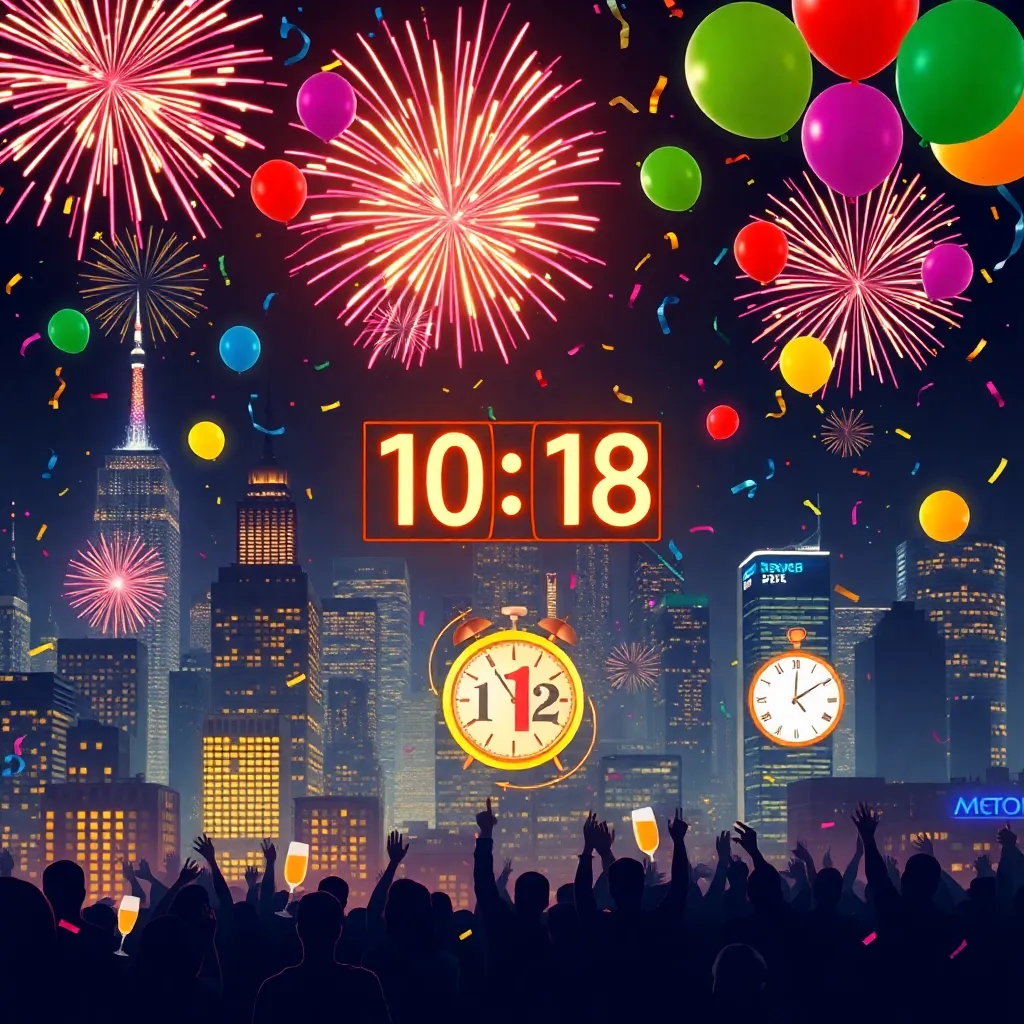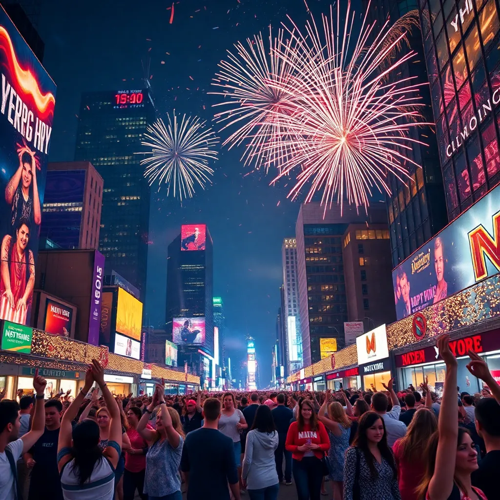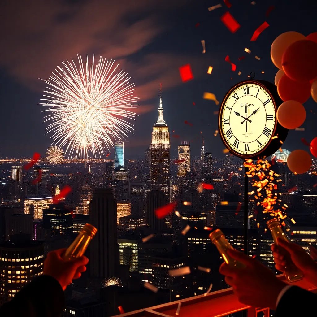 As the clock strikes midnight, a mesmerizing fireworks display illuminates the night sky above a bustling city square. Confetti and balloons swirl around joyful revelers, while a giant digital countdown timer hangs suspended above the scene. The air is electric with anticipation and celebration on this magical New Year's Eve.