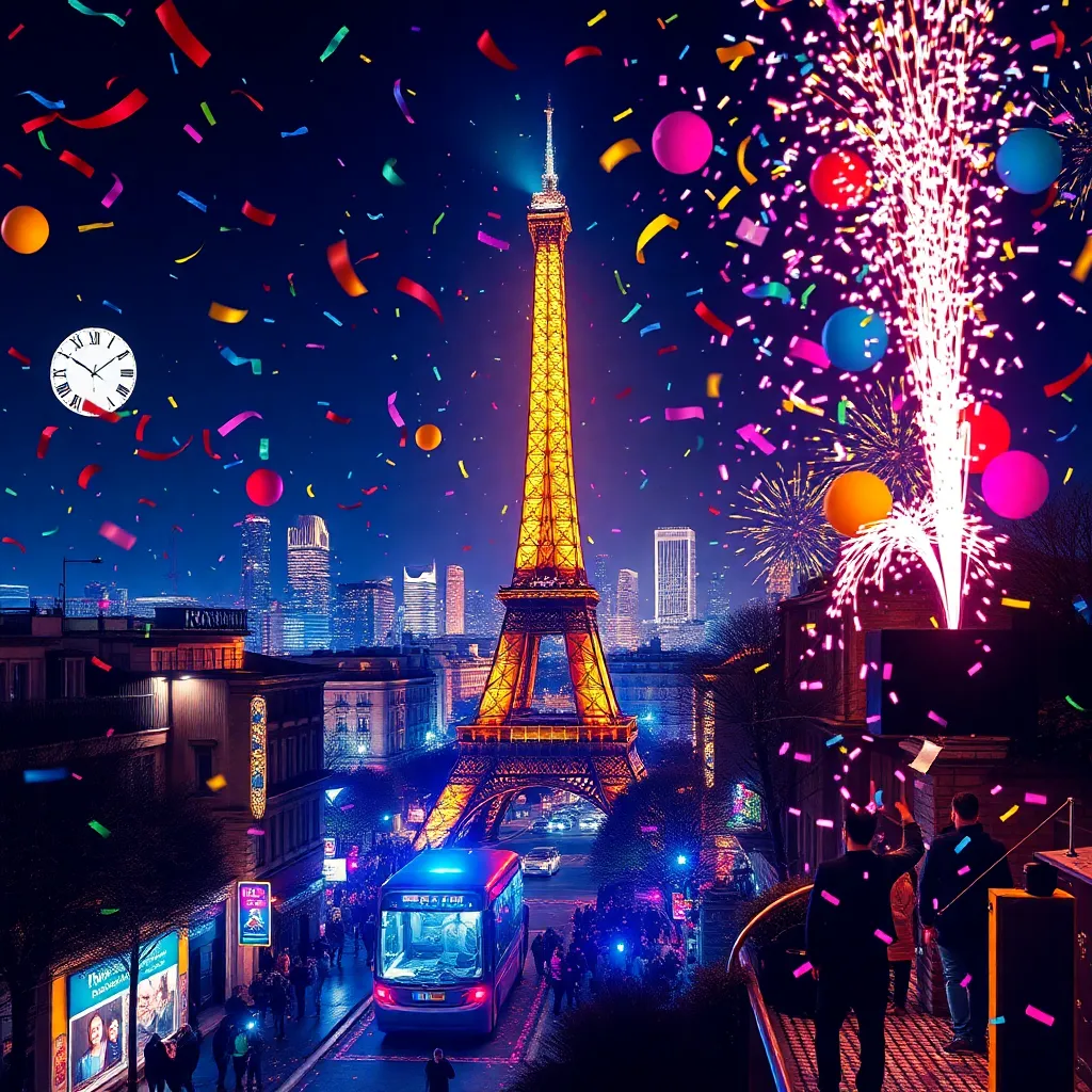 As the clock strikes midnight, a vibrant cityscape transforms into a kaleidoscope of colors. Confetti and balloons fill the air as revelers cheer and champagne bottles pop. The Eiffel Tower, a iconic symbol of celebration, shines bright amidst the festive atmosphere. Create an AI image capturing the magic of New Year's Eve.