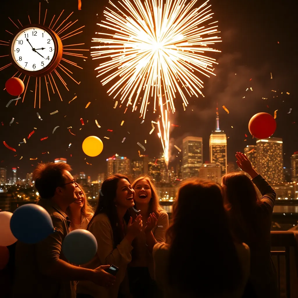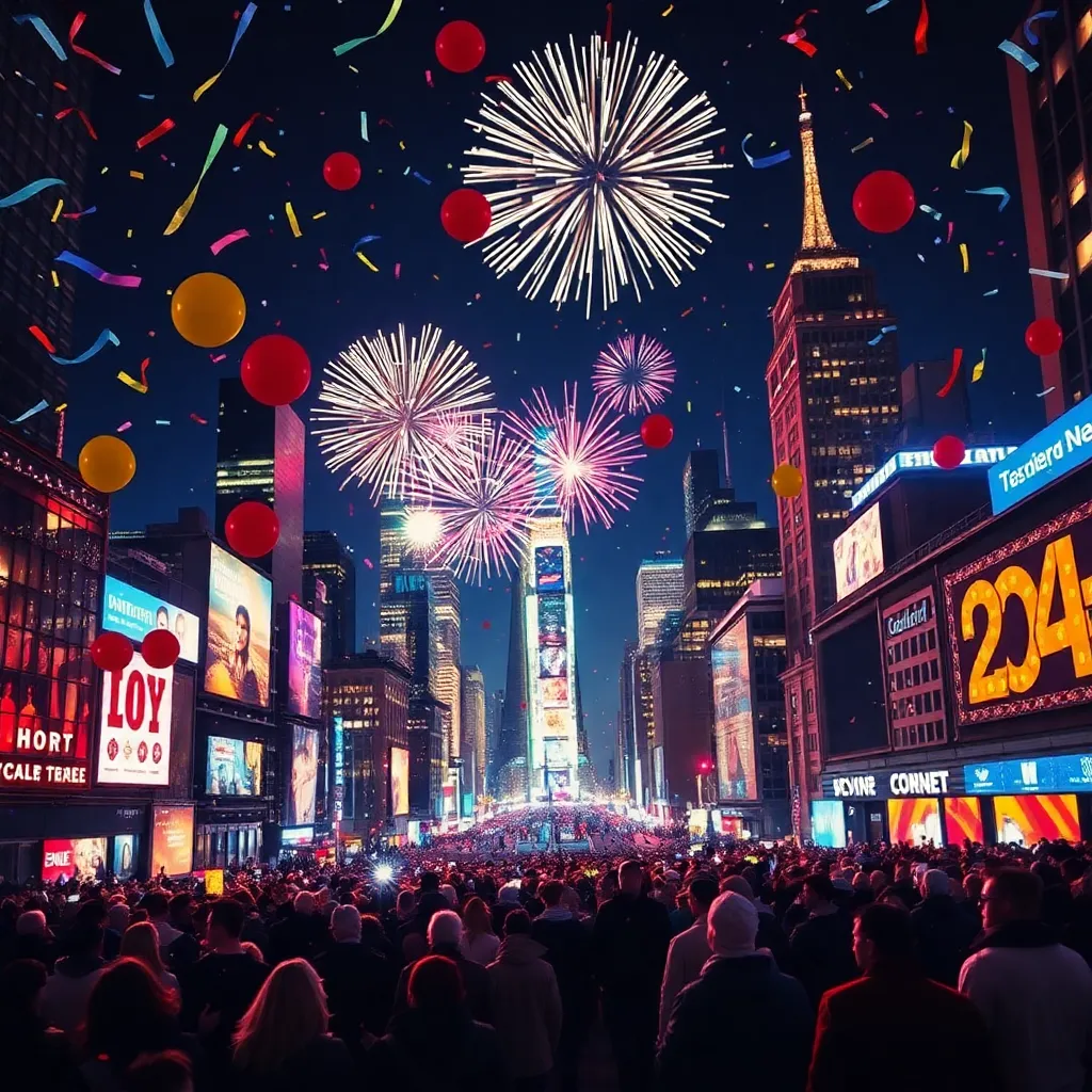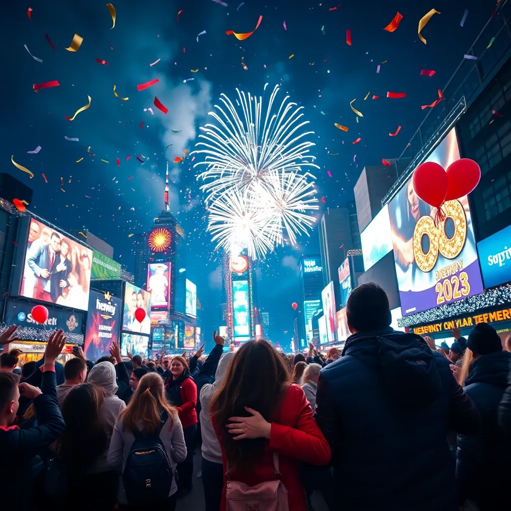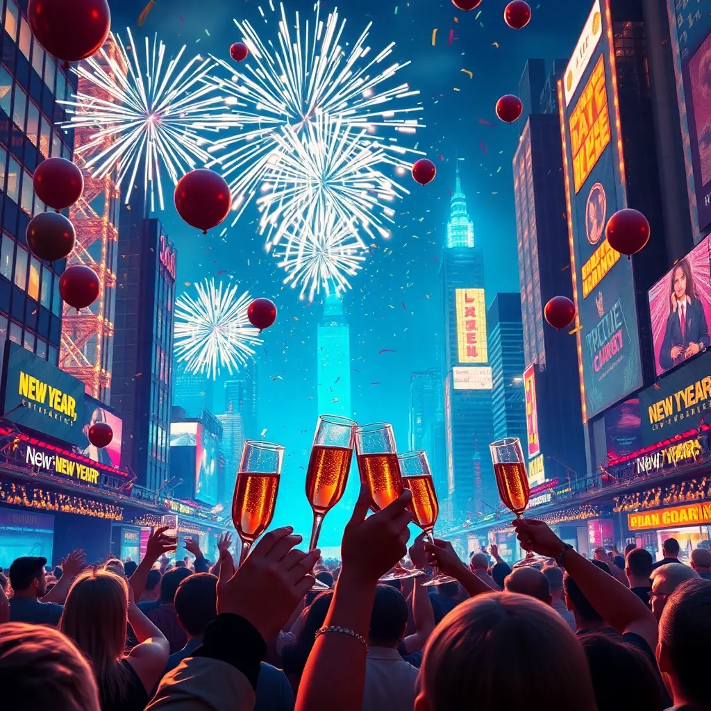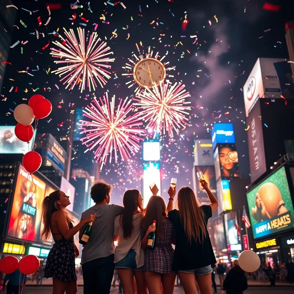 As the clock strikes midnight, a burst of confetti and glittering fireworks illuminate the sky. A group of friends stand together, champagne bottles in hand, surrounded by balloons and streamers. The cityscape behind them is aglow with vibrant lights and billboards, a kaleidoscope of colors celebrating the start of a new year.