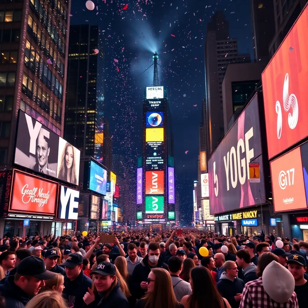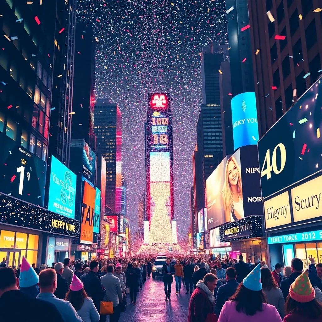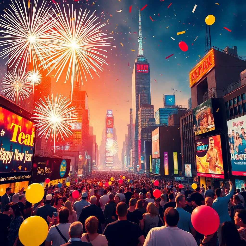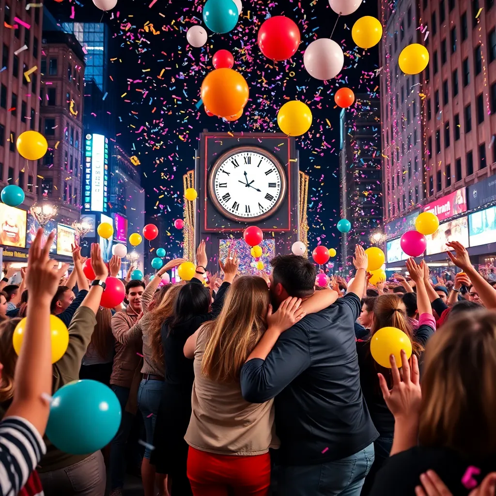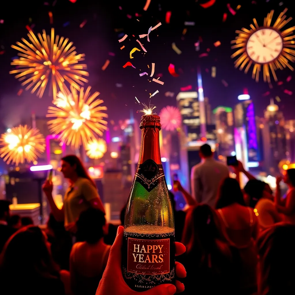 As the clock strikes midnight, a burst of confetti and glittering fireworks illuminate the sky. A group of friends stand together, champagne bottles in hand, surrounded by balloons and streamers. The cityscape behind them is aglow with vibrant lights and billboards, a kaleidoscope of colors celebrating the start of a new year.