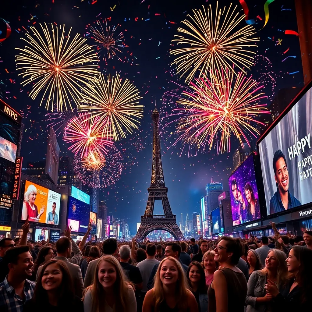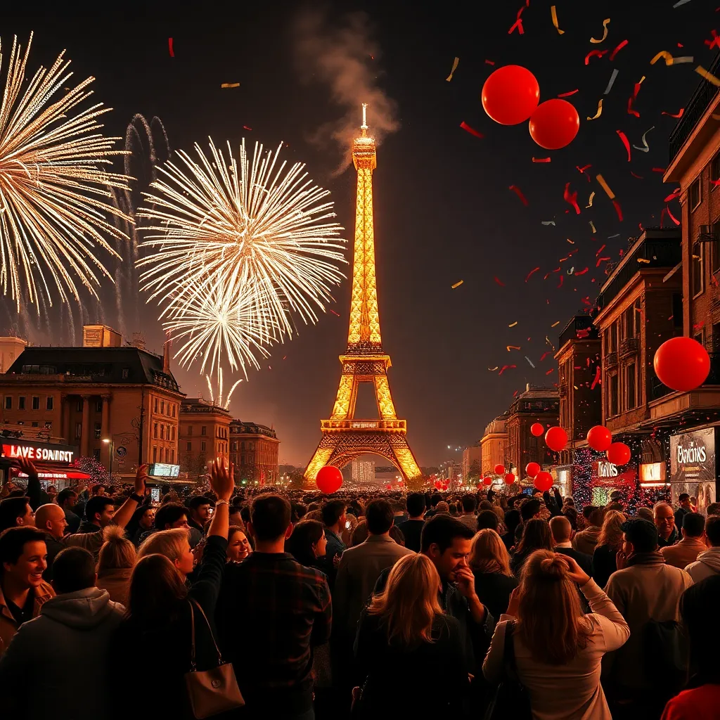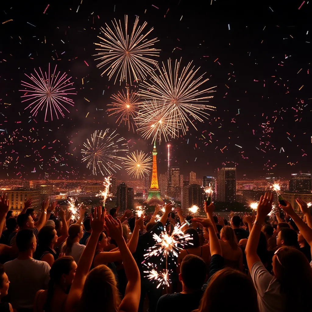 As the clock strikes midnight on New Year's Eve, a vibrant cityscape erupts in a kaleidoscope of confetti and fireworks. The Eiffel Tower shines bright, surrounded by cheering crowds and sparkling champagne bottles. The air is electric with anticipation and joy, as the world welcomes a brand new year.