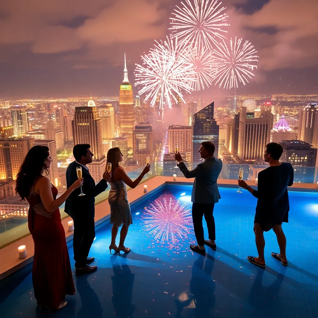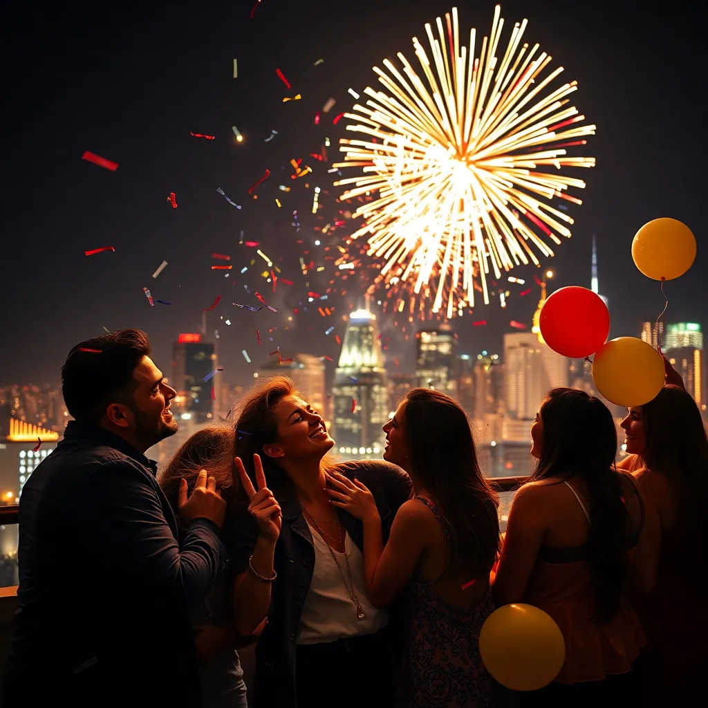 As the clock strikes midnight on New Year's Eve, a vibrant cityscape comes alive with confetti and fireworks. A diverse group of friends, each dressed in their finest attire, gather at the rooftop bar to toast the start of a new decade. The glittering lights of the city skyline serve as the perfect backdrop for their joyful celebration.