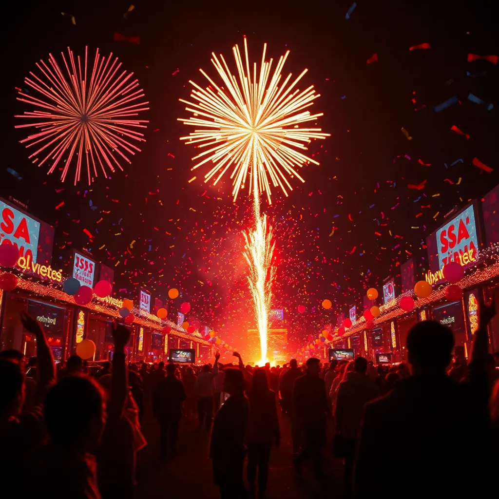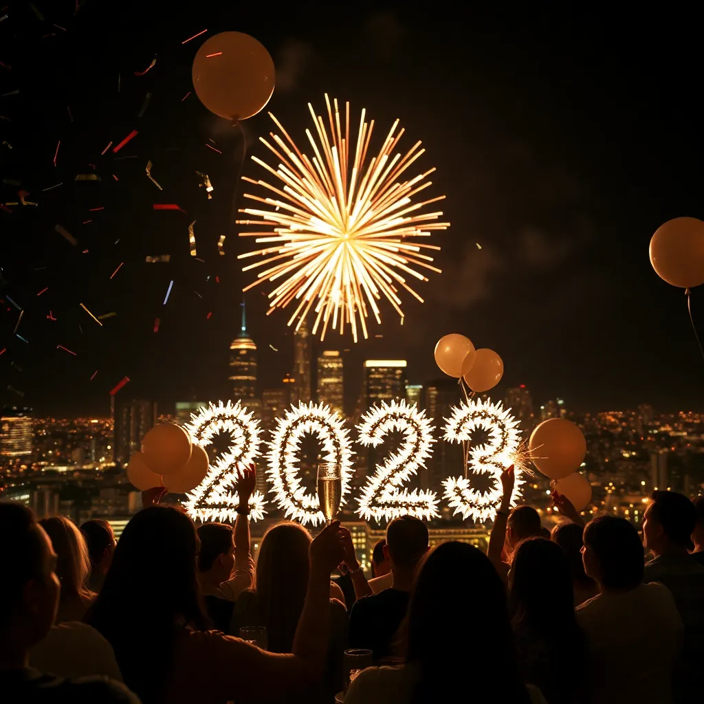 As the clock strikes midnight, a glittering fireworks display illuminates the night sky. Confetti and balloons fill the air as people from all walks of life come together to celebrate the start of a new year. Create a vibrant and festive AI image that captures the joy and excitement of this special night.