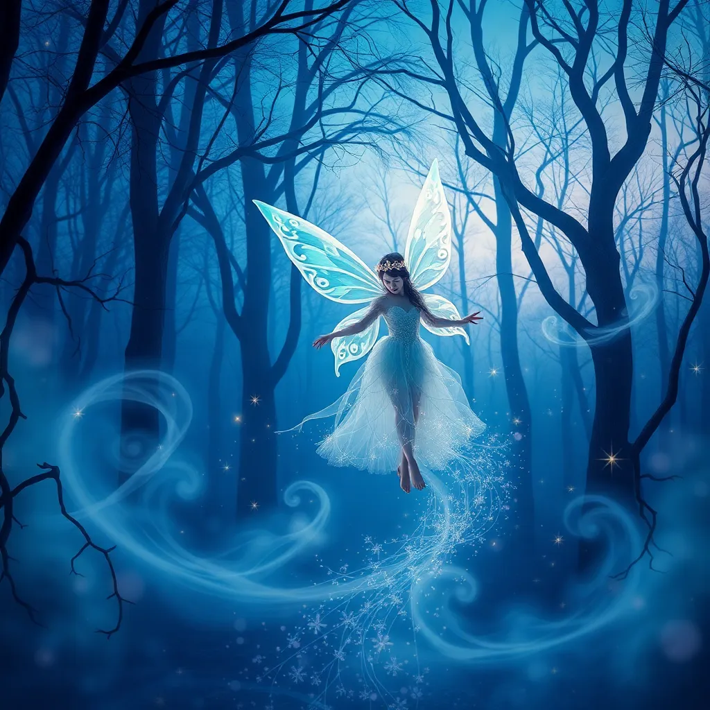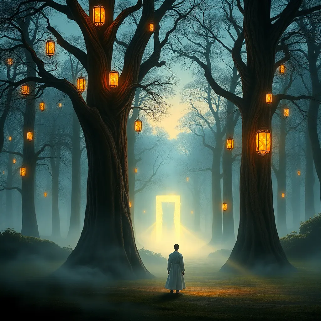 Create a surreal landscape with a glowing, ethereal tree standing tall amidst a swirling vortex of purple and blue mist. The tree's branches are adorned with sparkling, iridescent orbs that reflect the moon's gentle light. Incorporate intricate, swirling patterns and soft, shimmering colors to evoke a sense of mystique.