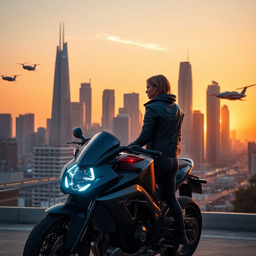 Create a futuristic cityscape at sunset, with towering skyscrapers and flying cars zipping by. The sky is a warm orange hue, with a few wispy clouds drifting lazily across the horizon. In the foreground, a sleek, high-tech motorcycle is parked, with a mysterious woman in a leather jacket leaning against it, looking out at the city with a sense of longing.