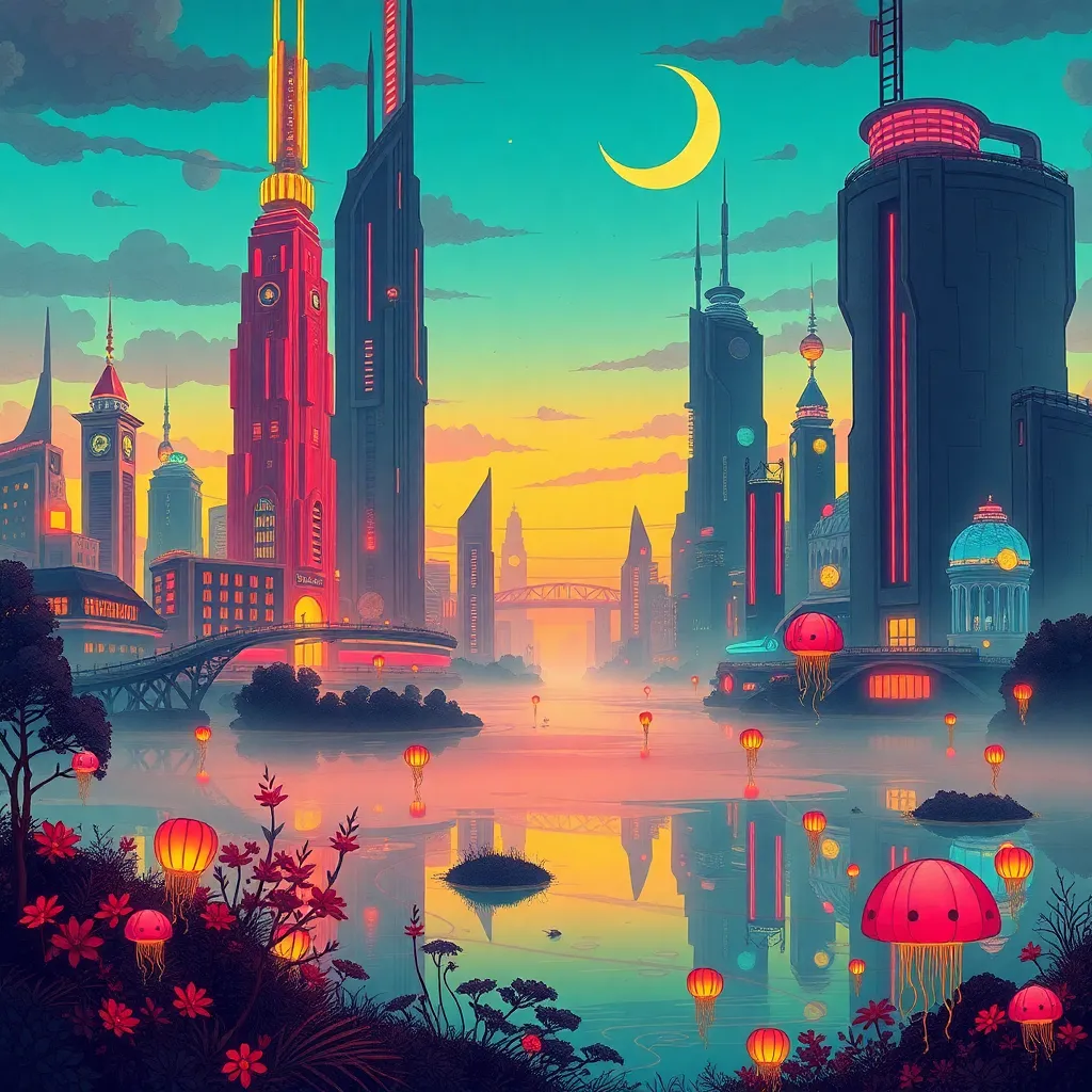 Create a surreal and whimsical illustration of a futuristic cityscape at dusk, with towering skyscrapers and neon lights reflecting off a misty lake. Incorporate fantastical elements such as floating lanterns, glowing jellyfish, and a crescent moon hanging low in the sky. Vibrant colors and intricate details please!