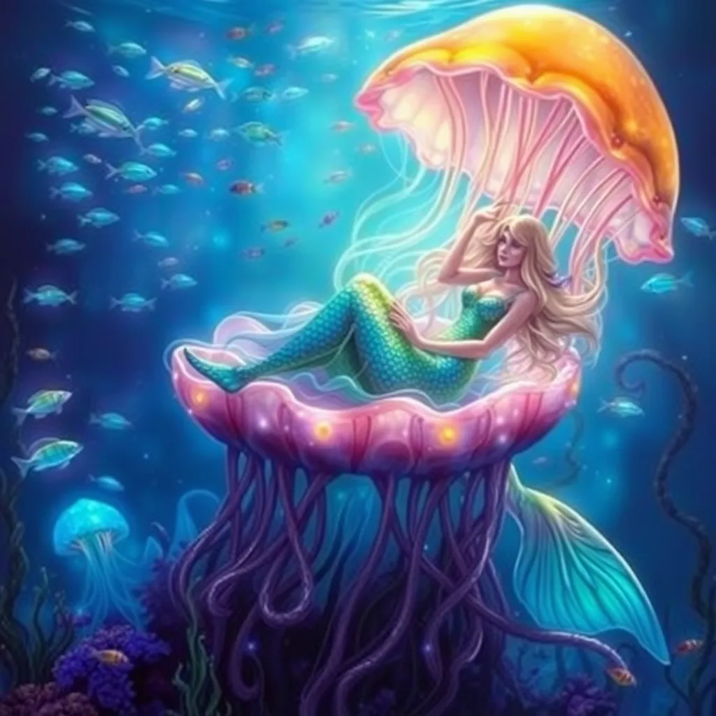 Create a mystical underwater scene featuring a mermaid lounging on a glowing jellyfish throne, surrounded by schools of bioluminescent fish and seaweed. The mermaid's long hair flows like the ocean currents, and her tail shimmers with iridescent scales. Use a mix of vibrant blues and purples to capture the magic.