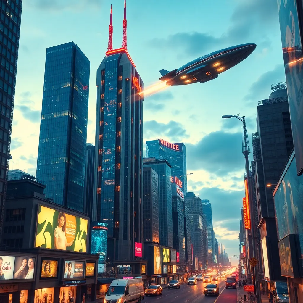 Create a stunning, futuristic cityscape at dusk. Towering skyscrapers made of neon-lit glass and steel pierce the sky, while holographic advertisements dance across the facades. A sleek, silver spaceship descends from the clouds, casting a warm glow over the bustling streets. The atmosphere is electric and vibrant, with a hint of intergalactic mystery.