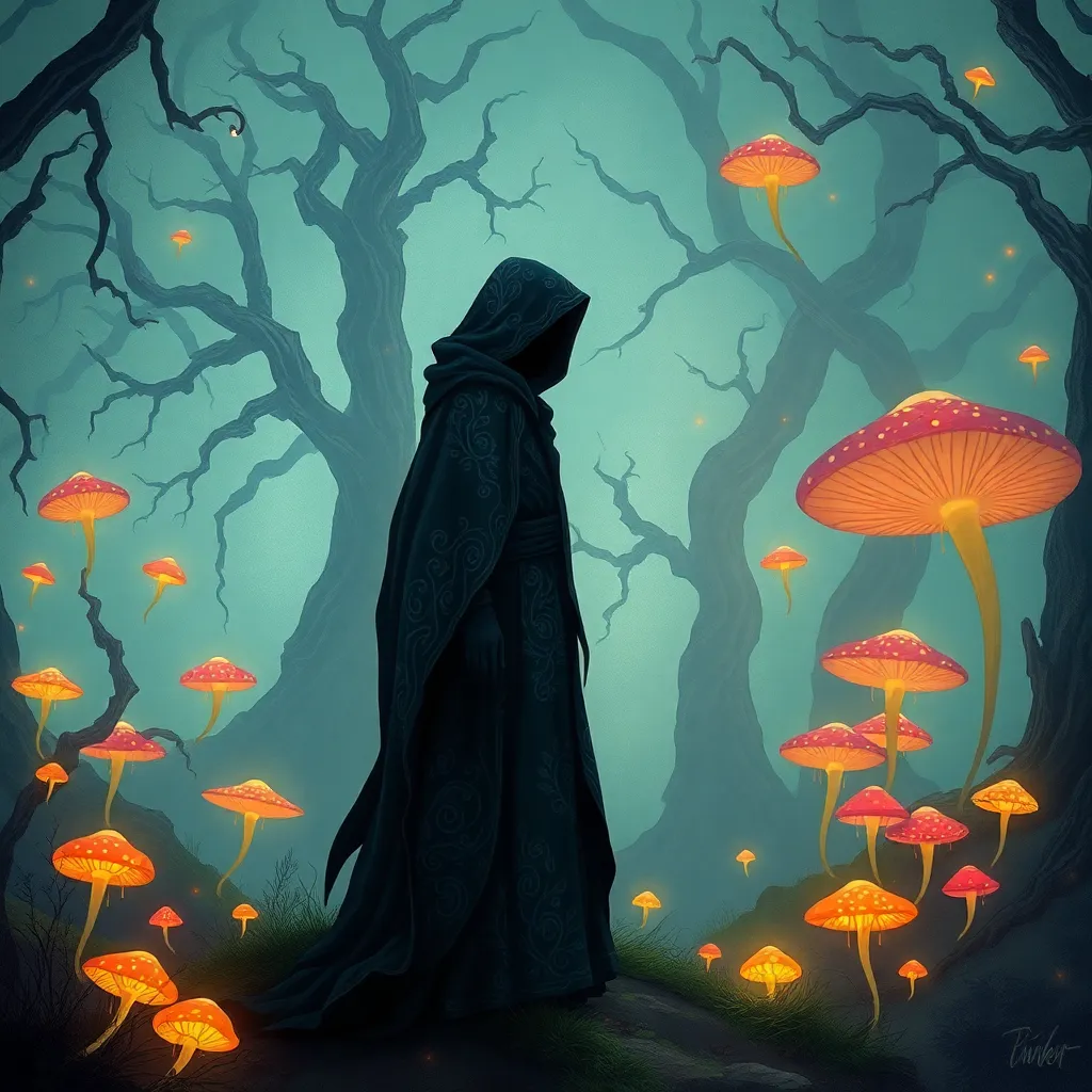 Create a surreal and mystical illustration of a lone figure standing at the edge of a misty forest, surrounded by glowing mushrooms and ancient trees. The figure should be dressed in flowing robes with intricate patterns, and the atmosphere should be eerie and enchanting. Use vibrant colors and whimsical details.