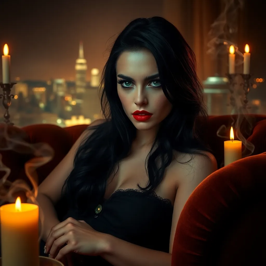 Create a sultry summer evening scene featuring a mysterious woman lounging on a plush velvet couch in a dimly lit, upscale penthouse apartment. She's wearing a daring red lace bodysuit, her long hair cascading down her back. The atmosphere is seductive, with candles flickering and a city skyline visible through the floor-to-ceiling windows.