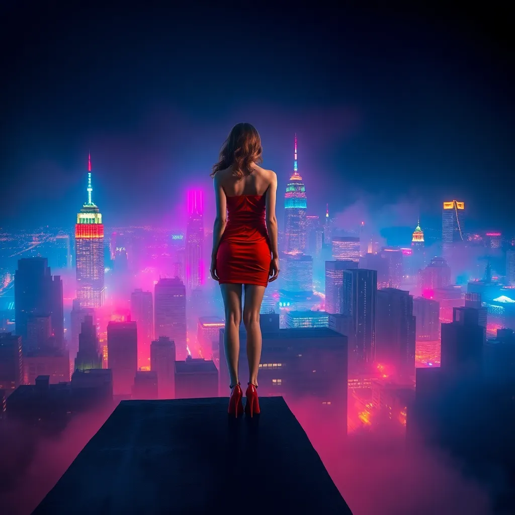 Create a sultry, futuristic cityscape at sunset. A sleek, silver skyscraper rises from the neon-lit streets, surrounded by hovering drones and flying cars. A mysterious, masked figure stands atop the building, gazing out at the city with a hint of danger and allure. Incorporate bold, neon colors and a moody atmosphere.