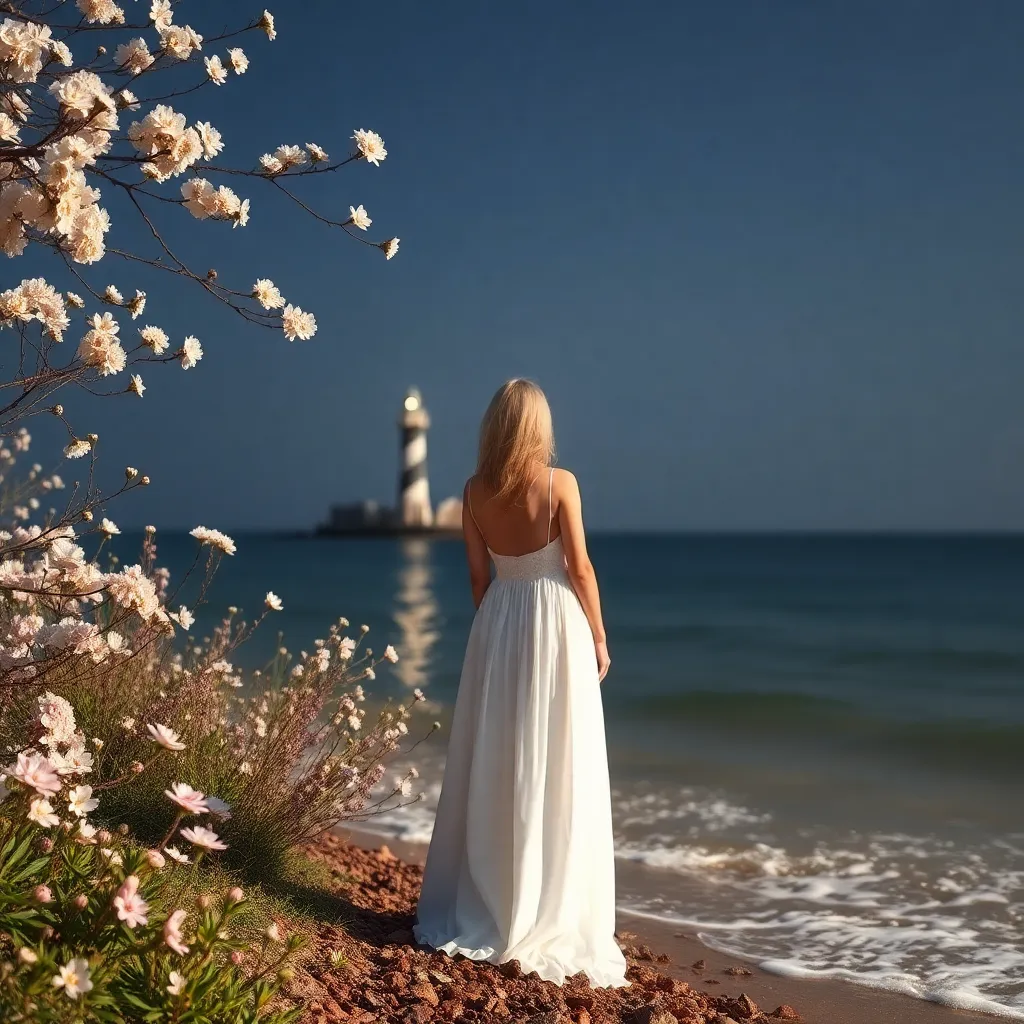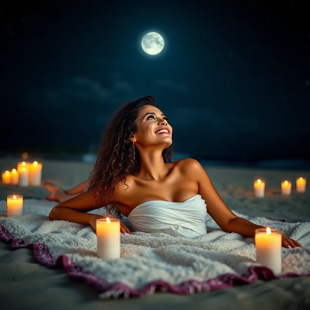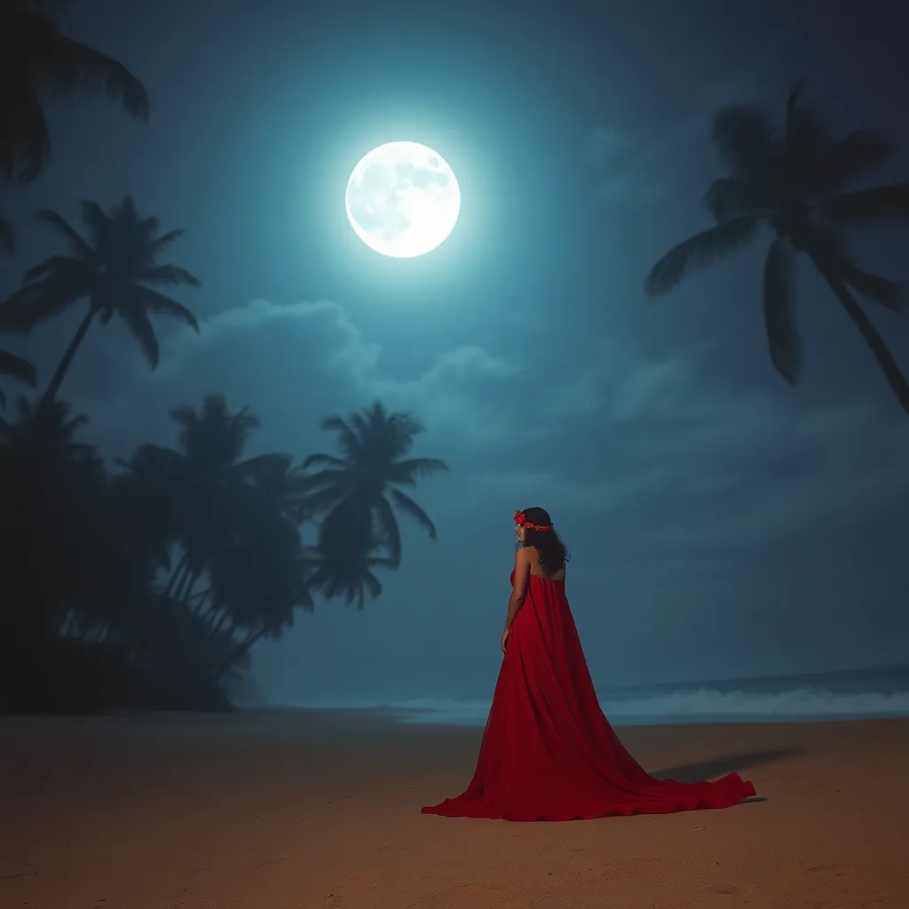 Create a sultry summer evening scene for an OnlyFans exclusive image. A mysterious woman in a flowing white dress stands alone on a moonlit beach, surrounded by towering palm trees and the sound of waves crashing in the distance. Incorporate subtle hints of neon lights and cityscape in the background.