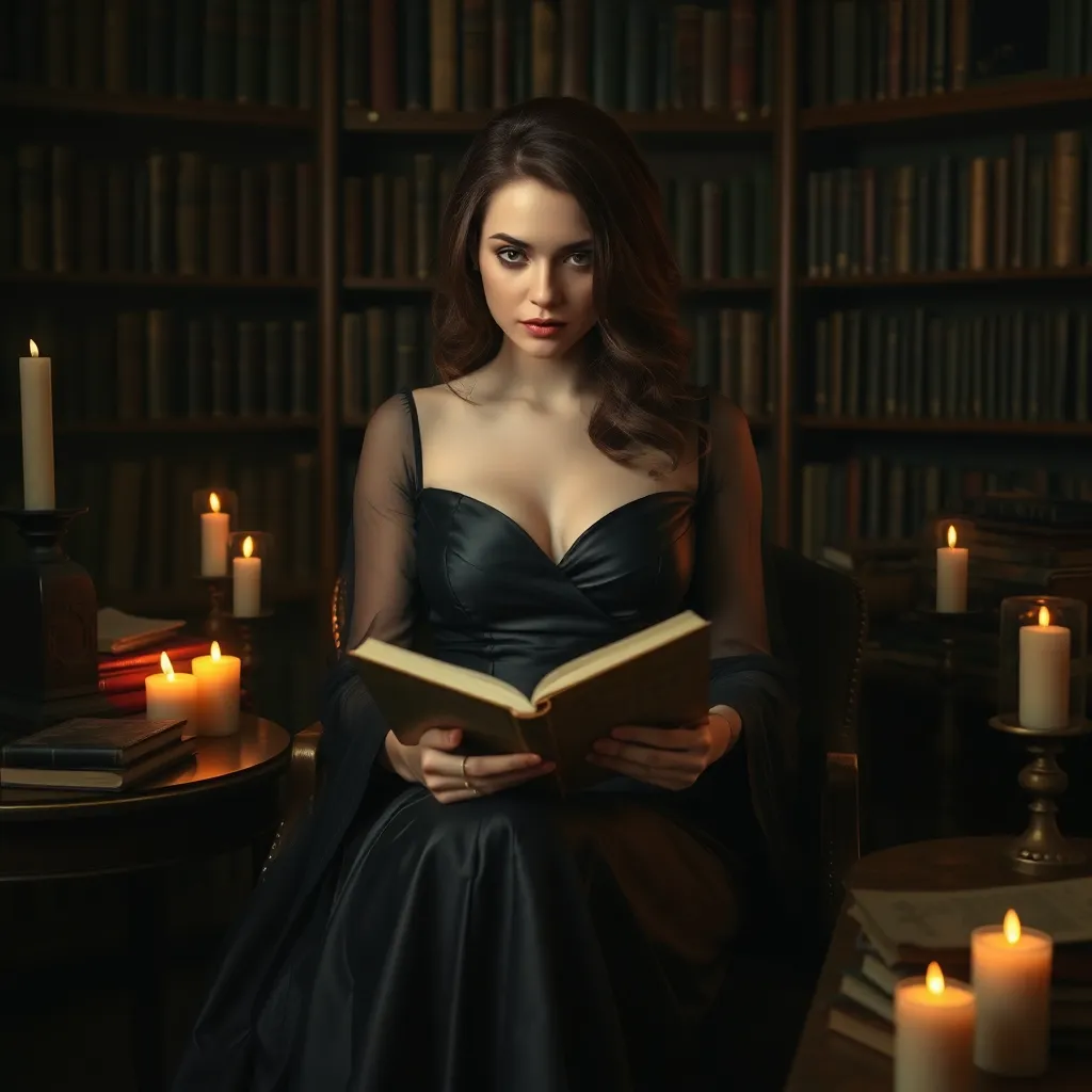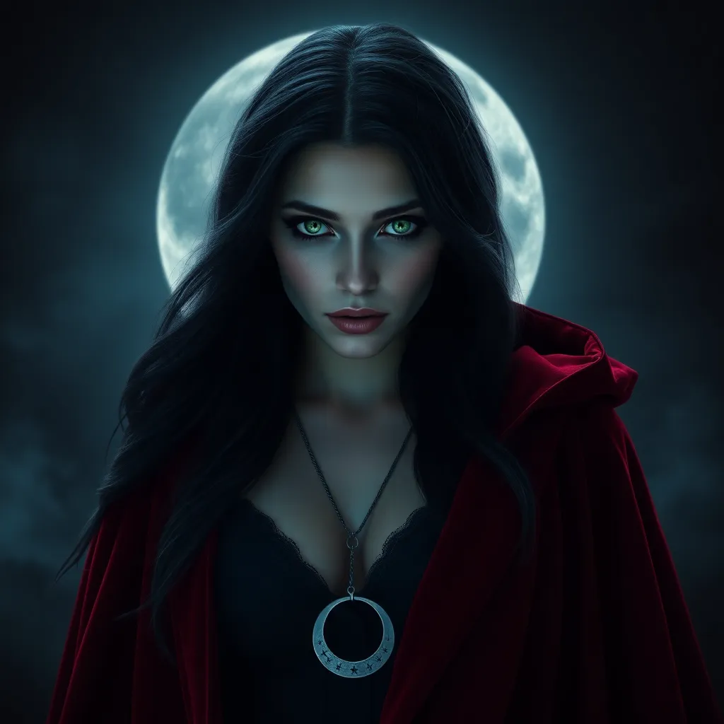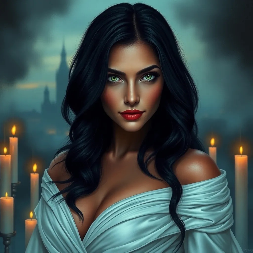 Create a sultry summer evening scene featuring a mysterious woman with piercing green eyes and raven-black hair, lounging on a velvet couch surrounded by candles and lush greenery. The atmosphere is intimate and alluring, with a hint of secrecy and temptation. Dress her in a daring red lingerie set.