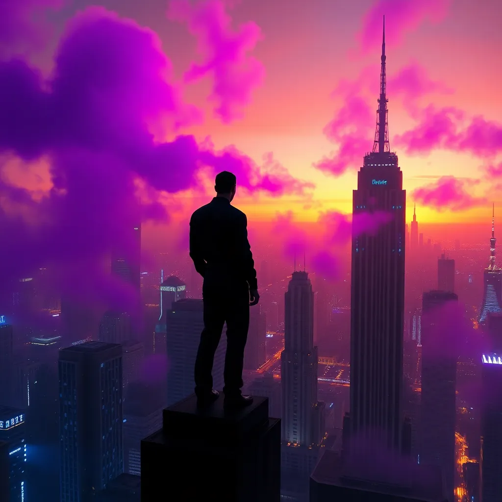 Create a sultry, futuristic cityscape at sunset. A lone figure, dressed in a sleek black jumpsuit, stands atop a skyscraper, gazing out at the neon-lit city. The air is filled with swirling purple fog. Incorporate glowing blue circuits and neon lights into the architecture. A sense of mystery and intrigue.