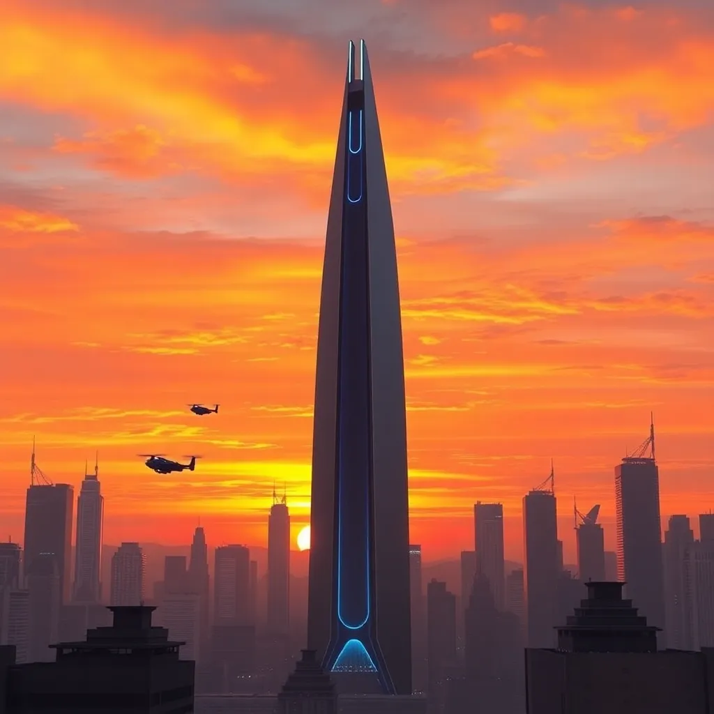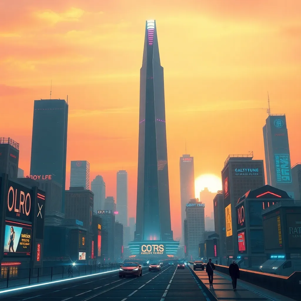 Create a futuristic cityscape at sunset with a sleek, silver skyscraper as the centerpiece. Incorporate neon lights and holographic advertisements. Add a few flying cars and pedestrians in futuristic attire. The sky should be a warm orange and pink hue with a subtle glow. Make the image vibrant and detailed.