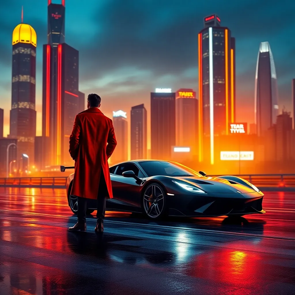 Create a stunning, futuristic cityscape at sunset with towering skyscrapers and neon lights reflecting off the wet pavement. Incorporate a sleek, silver sports car driving down the main street, with a bright pink glow emanating from the dashboard. Add a hint of smoke or fog to enhance the atmosphere.