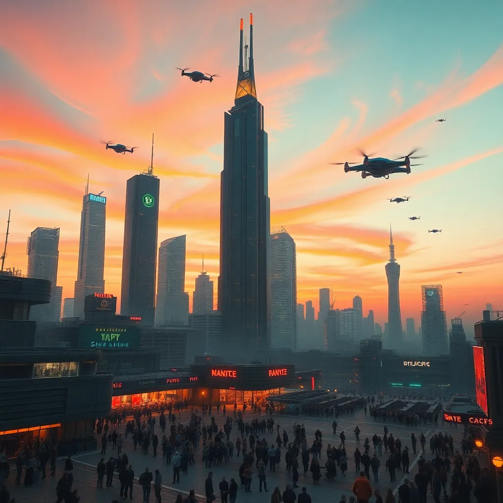 Create a surreal, futuristic cityscape at dusk. Incorporate towering skyscrapers with neon lights, hovering drones, and a sprawling city square filled with people from diverse backgrounds. The sky should be a warm orange-pink hue with wispy clouds. Incorporate subtle hints of steam punk and cyberpunk elements.